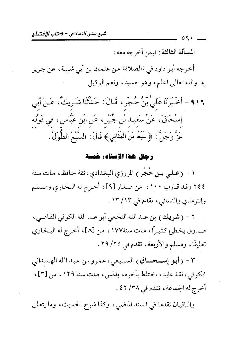 916 - أَخْبَرَنَا عَلِيُّ بْنُ حُجْرٍ، قَالَ: حَدَّثَنَا شَرِيكٌ، عَنْ أَبِي إِسْحَاقَ، عَنْ سَعِيدِ بْنِ جُبَيْرٍ، عَنِ ابْنِ عَبَّاسٍ، فِي قَوْلِهِ عَزَّ وَجَلَّ: {سَبْعًا مِنَ الْمَثَانِي} قَالَ: السَّبْعُ الطُّوَلُ.