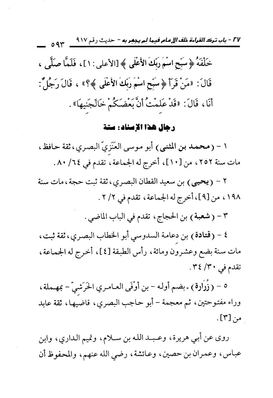5 - (زُرَارة) -بضم أوله- بن أوْفَى العامري الحَرَشيّ -بمهملة، وراء مفتوحتين، ثم معجمة- أبو حاجب البصري، قاضَيها، ثقة عابد