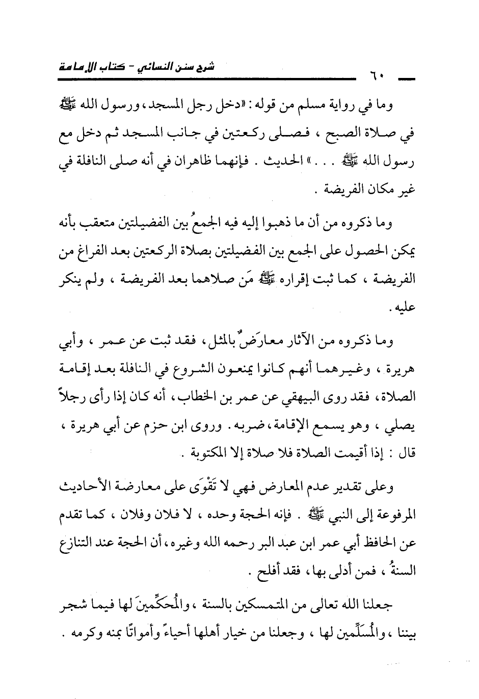 وما ذكروه من الآثار معارَضٌ بالمثل، فقد ثبت عن عمر، وأبي هريرة، وغيرهما أنهم كانوا يمنعون الشروع في النافلة بعد إقامة الصلاة، فقد روى البيهقي عن عمر بن الخطاب، أنه كان إذا رأى رجلاً يصلي، وهو يسمع الإقامة، ضربه. وروى ابن حزم عن أبي هريرة، قال: إذا أقيمت الصلاة فلا صلاة إلا المكتوبة.