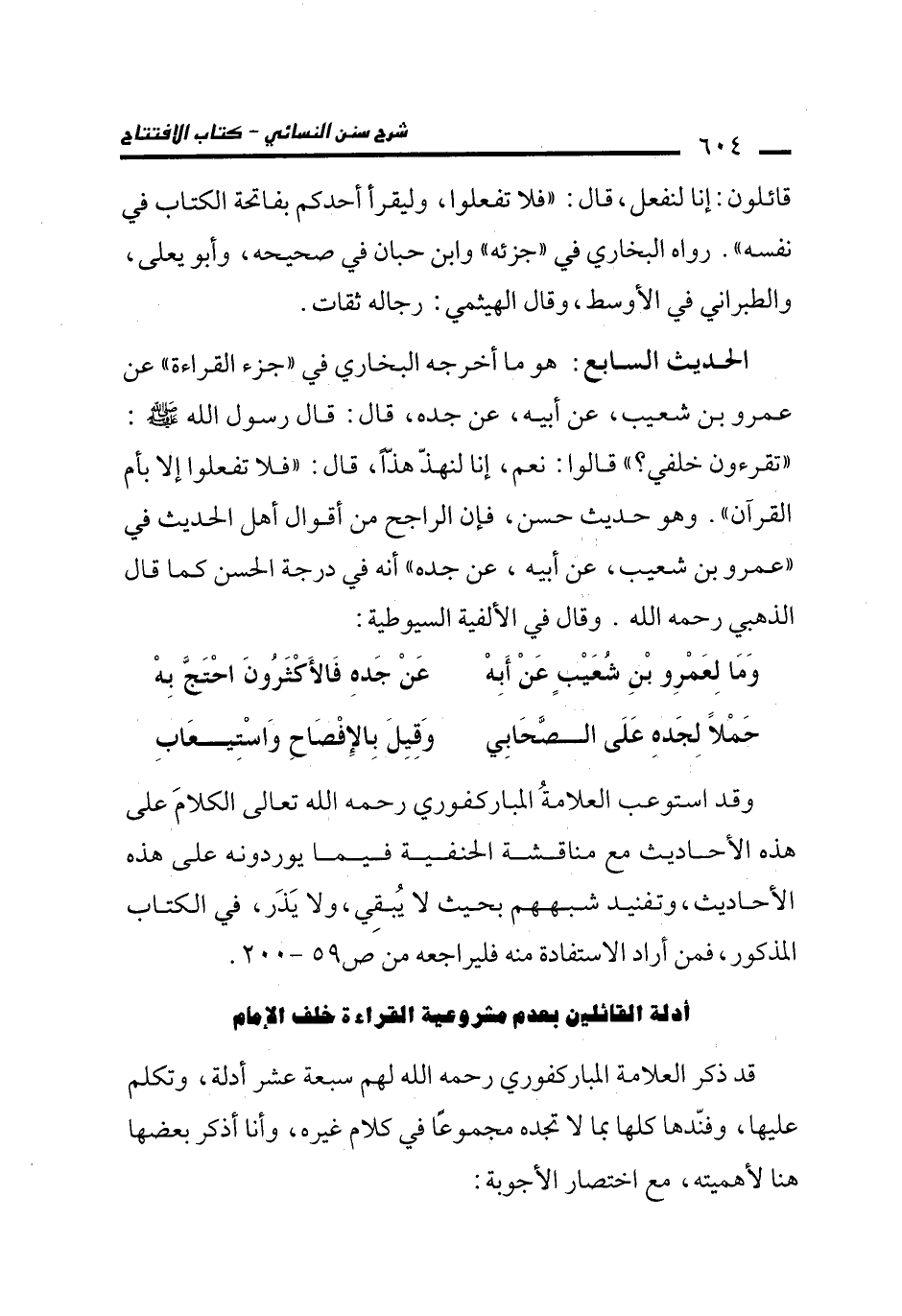 الحديث السابع: هو ما أخرجه البخاري في "جزء القراءة" عن عمرو بن شعيب، عن أبيه، عن جده، قال: قال رسول الله - صلى الله عليه وسلم -: "تقرءون خلفي؟ " قالوا: نعم، إنا لنهذّ هذًّا، قال: "فلا تفعلوا إلا بأم القرآن". وهو حديث حسن، فإن الراجح من أقوال أهل الحديث في "عمرو بن شعيب، عن أبيه، عن جده" أنه في درجة الحسن كما قال الذهبي رحمه الله. وقال في الألفية السيوطية: