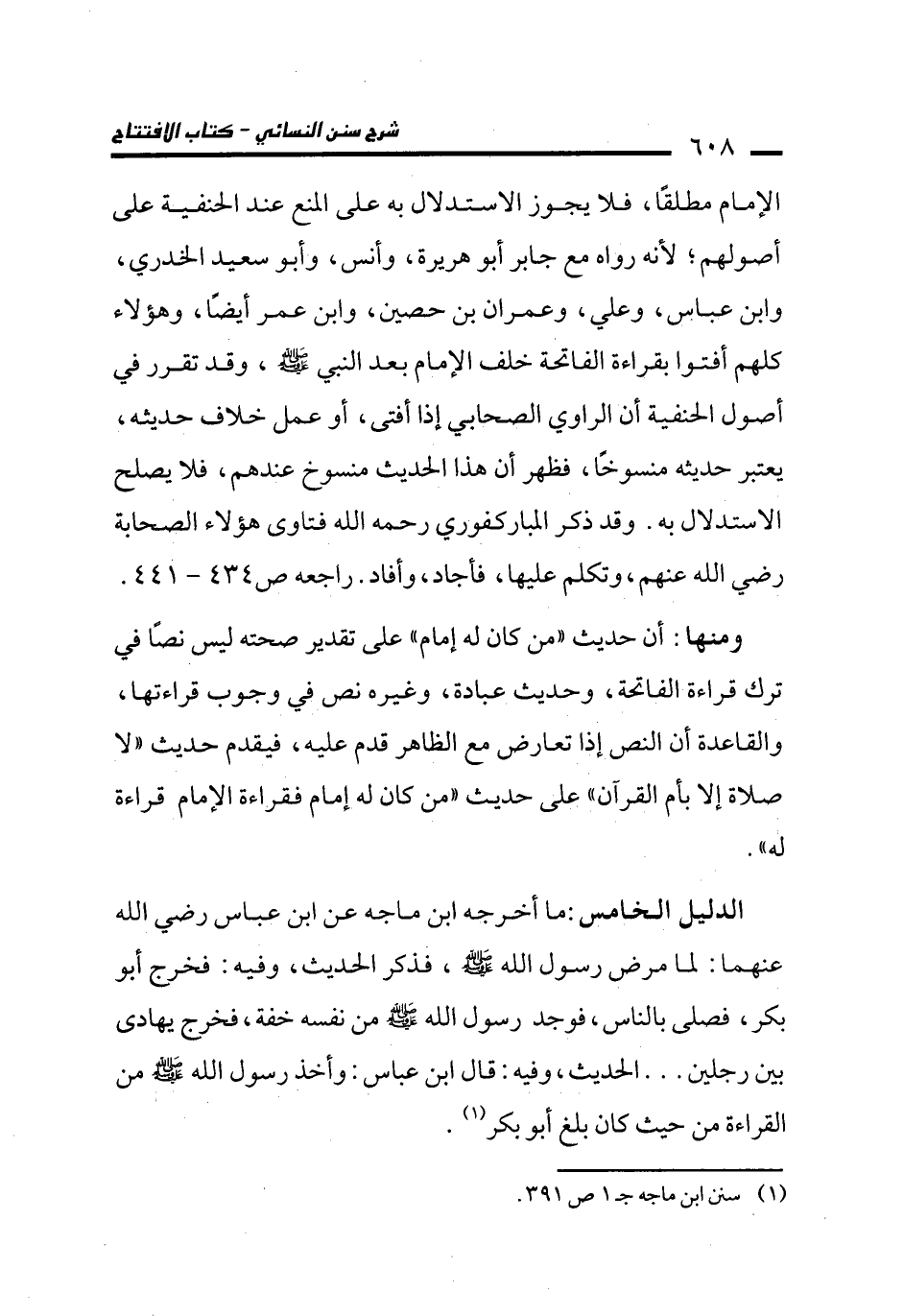الدليل الخامس: ما أخرجه ابن ماجه عن ابن عباس رضي الله عنهما: لما مرض رسول الله - صلى الله عليه وسلم -، فذكر الحديث، وفيه: فخرج أبو بكر، فصلى بالناس، فوجد رسول الله - صلى الله عليه وسلم - من نفسه خفة، فخرج يهادى بين رجلين ... الحديث، وفيه: قال ابن عباس: وأخذ رسول الله - صلى الله عليه وسلم - من القراءة من حيث كان بلغ أبو بكر (¬1).