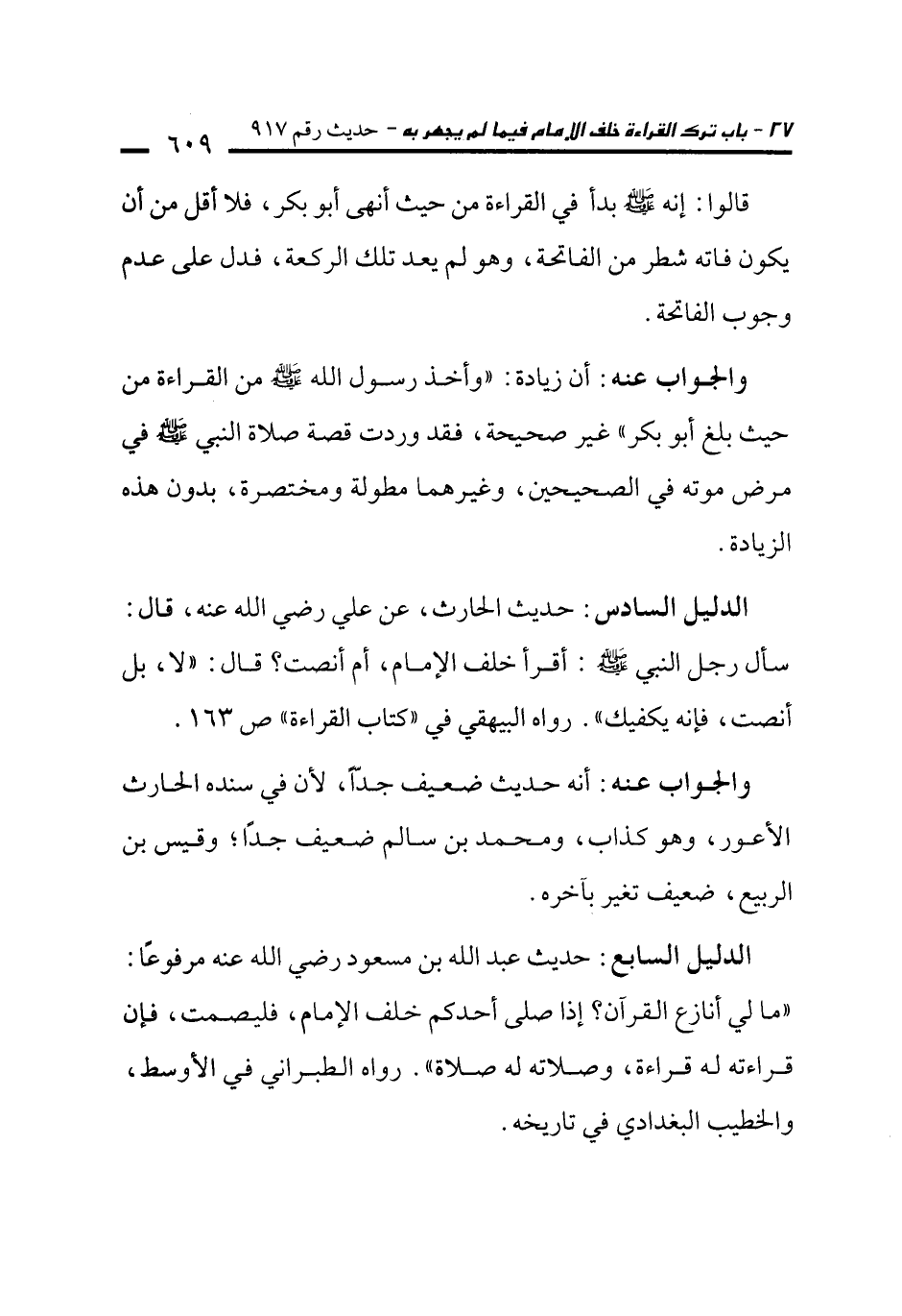 الدليل السادس: حديث الحارث، عن علي رضي الله عنه، قال: سأل رجل النبي - صلى الله عليه وسلم -: أقرأ خلف الإمام، أم أنصت؟ قال: "لا، بل أنصت، فإنه يكفيك". رواه البيهقي في "كتاب القراءة" ص 163.
