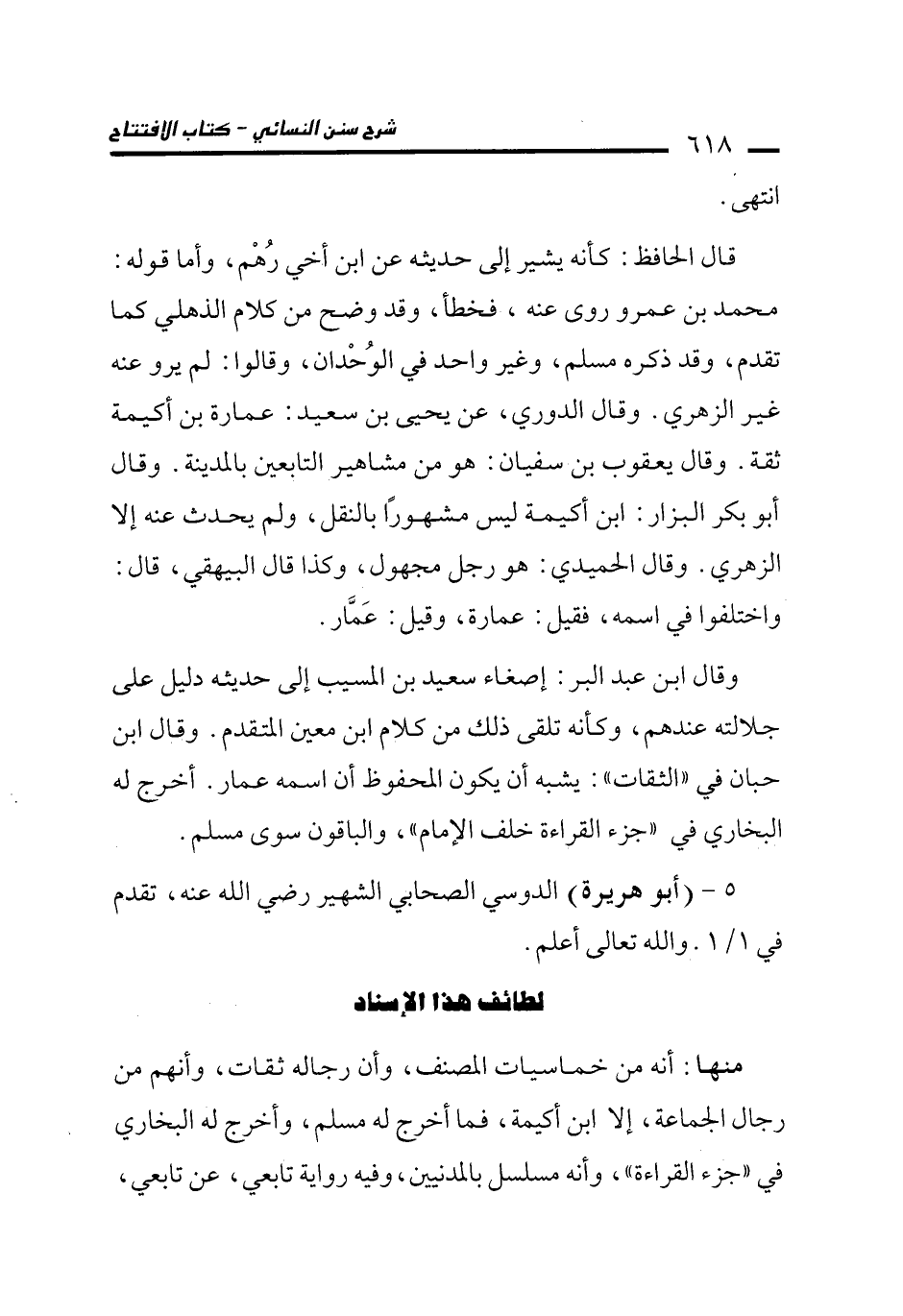 قال الحافظ: كأنه يشير إلى حديثه عن ابن أخي رُهْم، وأما قوله: محمد بن عمرو روى عنه، فخطأ، وقد وضح من كلام الذهلي كما تقدم، وقد ذكره مسلم، وغير واحد في الوُحْدان، وقالوا: لم يرو عنه غير الزهري. وقال الدوري، عن يحيى بن سعيد: عمارة بن أكيمة ثقة. وقال يعقوب بن سفيان: هو من مشاهير التابعين بالمدينة. وقال أبو بكر البزار: ابن أكيمة ليس مشهورًا بالنقل، ولم يحدث عنه إلا الزهري. وقال الحميدي: هو رجل مجهول، وكذا قال البيهقي، قال: واختلفوا في اسمه، فقيل: عمارة، وقيل: عَمَّار.
