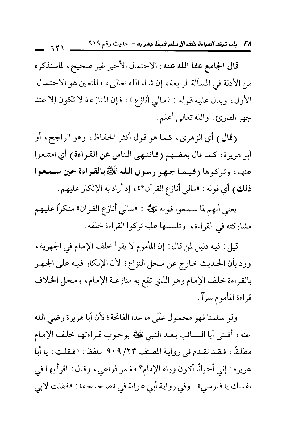 ولو سلمنا فهو محمول عَلَى ما عدا الفاتحة؛ لأن أبا هريرة رضي الله عنه، أفتى أبا السائب بعد النبي - صلى الله عليه وسلم - بوجوب قراءتها خلف الإمام مطلقًا، فقد تقدم في رواية المصنف 23/ 909 بلفظ: "فقلت: يا أبا هريرة: إني أحيانًا أكون وراء الإمام؟ فغمز ذراعي، وقال: اقرأ بها في نفسك يا فارسي". وفي رواية أبي عوانة في "صحيحه": "فقلت لأبي