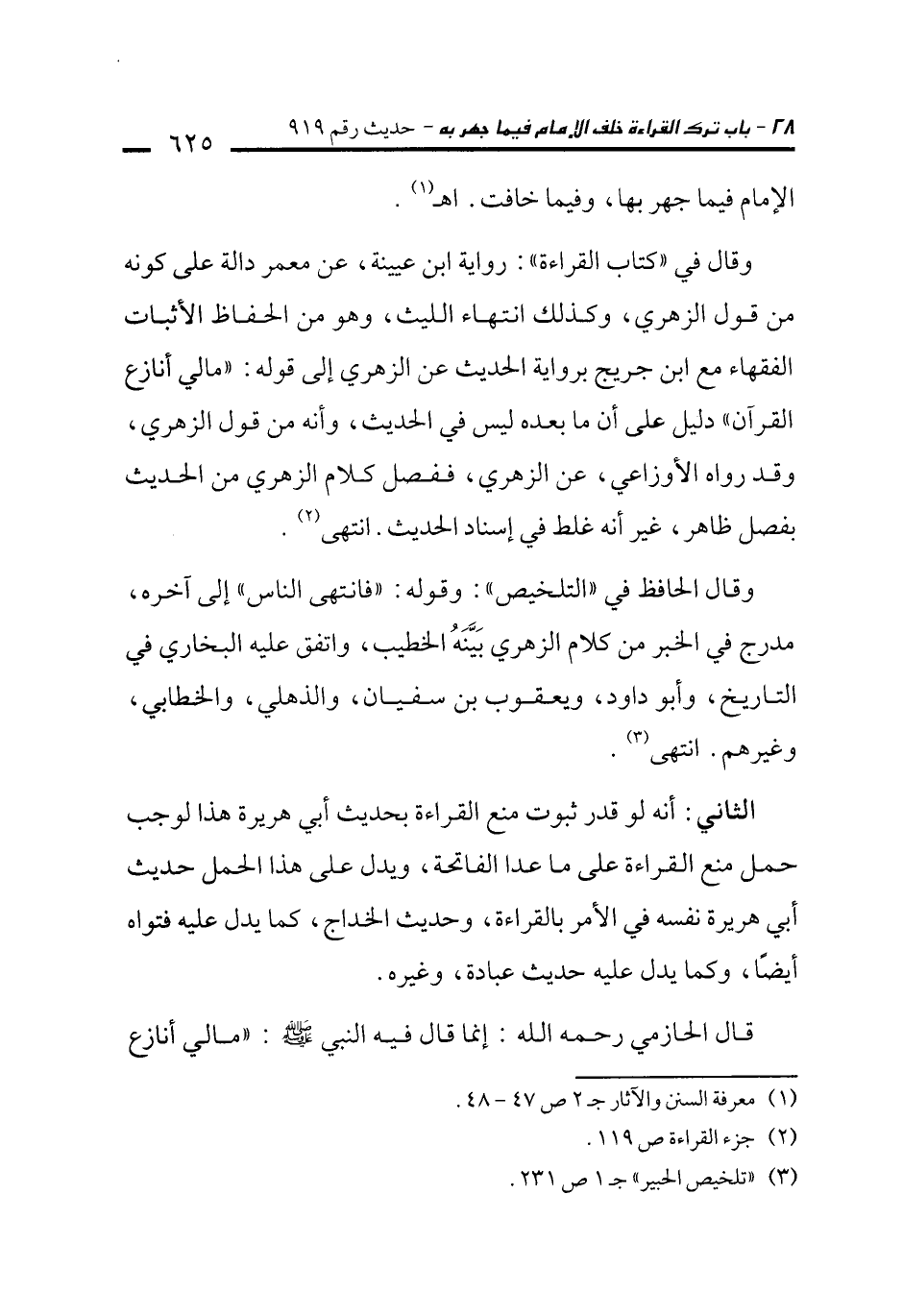 الثاني: أنه لو قدر ثبوت منع القراءة بحديث أبي هريرة هذا لوجب حمل منع القراءة على ما عدا الفاتحة، ويدل على هذا الحمل حديث أبي هريرة نفسه في الأمر بالقراءة، وحديث الخداج، كما يدل عليه فتواه أيضًا، وكما يدل عليه حديث عبادة، وغيره.