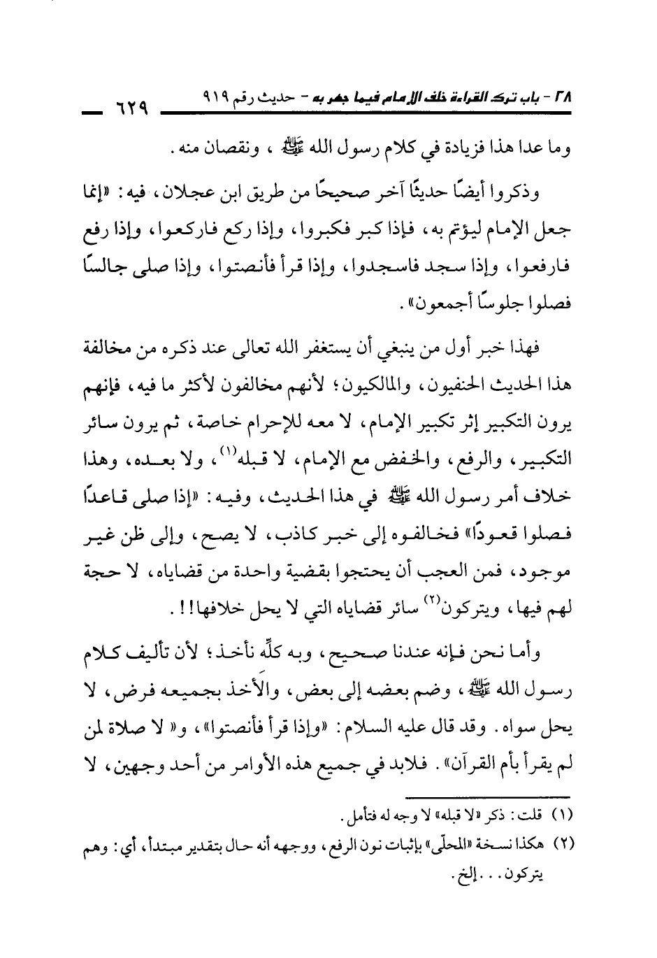 وذكروا أيضًا حديثًا آخر صحيحًا من طريق ابن عجلان، فيه: "إنما جعل الإمام ليؤتم به، فإذا كبر فكبروا، وإذا ركع فاركعوا، وإذا رفع فارفعوا، وإذا سجد فاسجدوا، وإذا قرأ فأنصتوا، وإذا صلى جالسًا فصلوا جلوسًا أجمعون".