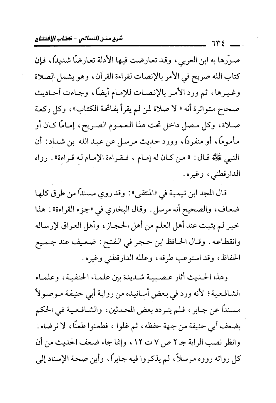وهذا الحديث أثار عصبية شديدة بين علماء الحنفية، وعلماء الشافعية؛ لأنه ورد في بعض أسانيده من رواية أبي حنيفة موصولًا مسندًا عن جابر، فلم يتردد بعض المحدثين، والشافعية في الحكم بضعف أبي حنيفة من جهة حفظه، ثم غلوا، فطعنوا طعنًا، لا نرضاه. وانظر نصب الراية جـ 2 ص 7 ت 12، وإنما جاء ضعف الحديث من أن كل رواته رووه مرسلًا، لم يذكروا فيه جابرًا، وأين صحة الإسناد إلى