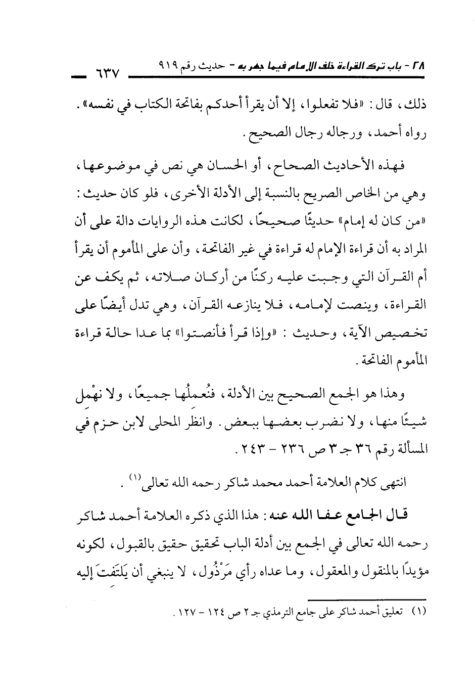 قال الجامع عفا الله عنه: هذا الذي ذكره العلامة أحمد شاكر رحمه الله تعالى في الجمع بين أدلة الباب تحقيق حقيق بالقبول، لكونه