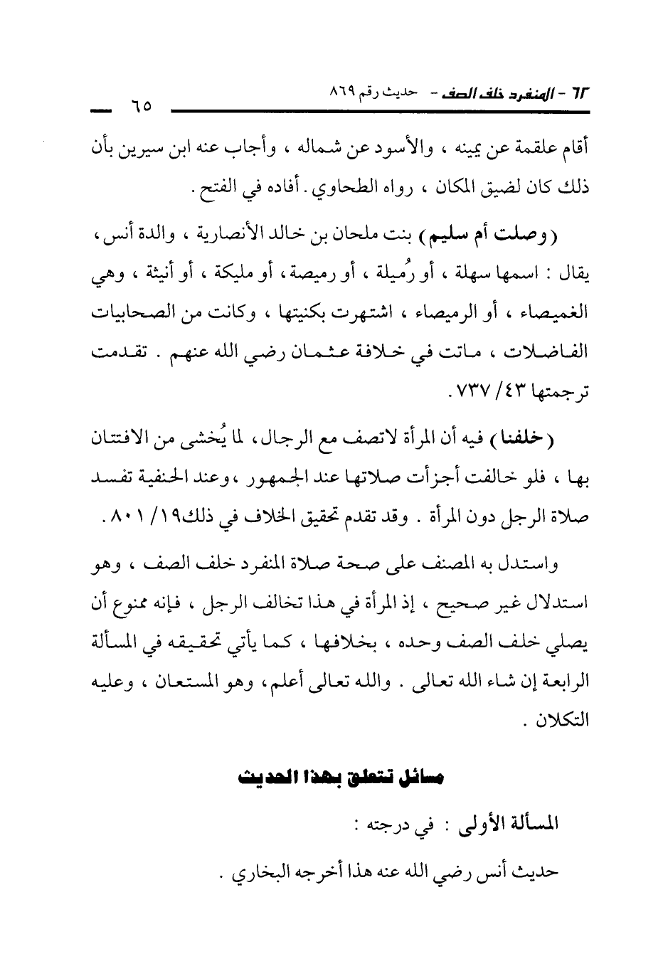 واستدل به المصنف على صحة صلاة المنفرد خلف الصف، وهو استدلال غير صحيح، إذ المرأة في هذا تخالف الرجل، فإنه ممنوع أن يصلي خلف الصف وحده، بخلافها، كما يأتي تحقيقه في المسألة الرابعة إن شاء الله تعالى. والله تعالى أعلم، وهو المستعان، وعليه التكلان.
