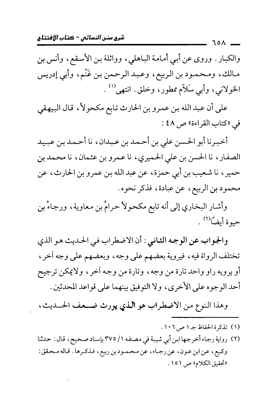 والجواب عن الوجه الثاني: أن الاضطراب في الحديث هو الذي تختلف الرواة فيه، فيروية بعضهم على وجه، وبعضهم على وجه آخر، أو يرويه راو واحد تارة من وجه، وتارة من وجه آخر، ولا يمكن ترجيح أحد الوجوه على الأخرى، ولا التوفيق بينهما على قواعد المحدثين.