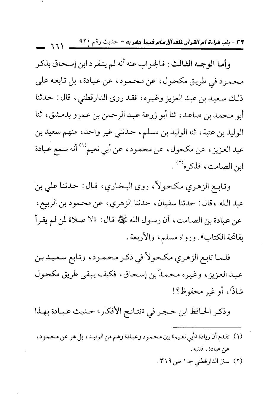 وأما الوجه الثالث: فالجواب عنه أنه لم يتفرد ابن إسحاق بذكر محمود في طريق مكحول، عن محمود، عن عبادة، بل تابعه على