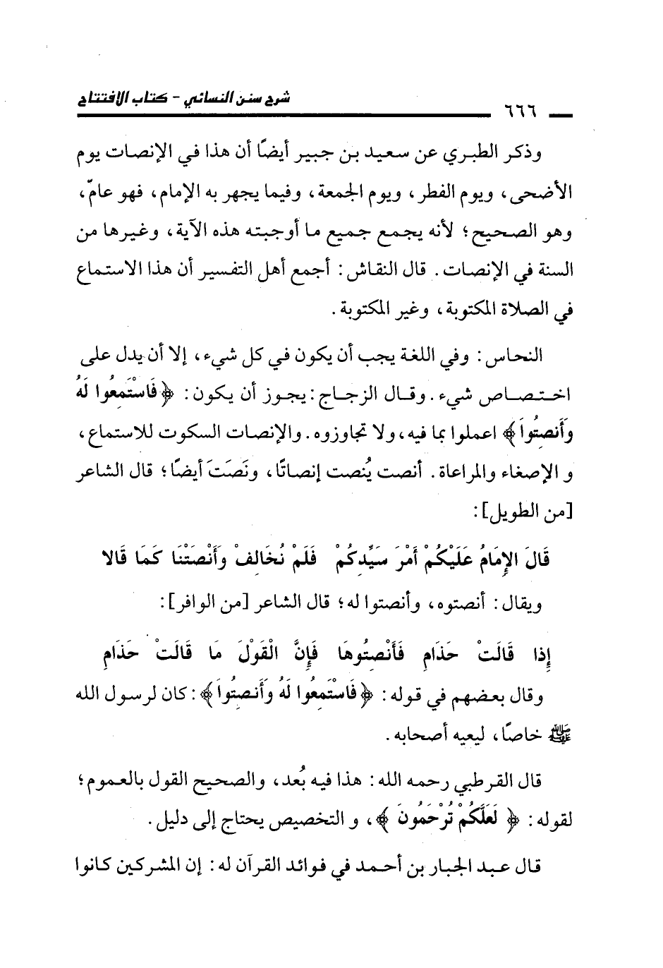 النحاس: وفي اللغة يجب أن يكون في كل شيء، إلا أن يدل على اختصاص شيء. وقال الزجاج: يجوز أن يكون: {فَاسْتَمِعُوا لَهُ وَأَنْصِتُوا} اعملوا بما فيه، ولا تجاوزوه. والإنصات السكوت للاستماع، والإصغاء والمراعاة. أنصت يُنصت إنصاتًا، ونَصَتَ أيضًا، قال الشاعر [من الطويل]: