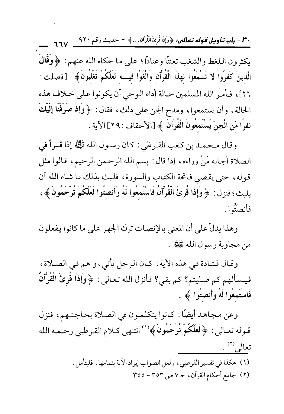 وعن مجاهد أيضًا: كانوا يتكلمون في الصلاة بحاجتهم، فنزل قوله تعالى: {لَعَلَّكُمْ تُرْحَمُونَ} (¬1) انتهى كلام القرطبي رحمه الله تعالى (¬2).