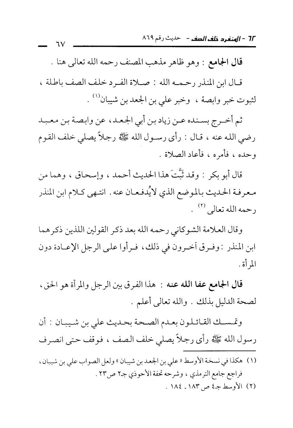 قال ابن المنذر رحمه الله: صلاة الفرد خلف الصف باطلة، لثبوت خبر وابصة، وخبر علي بن الجعد بن شيبان (¬1).