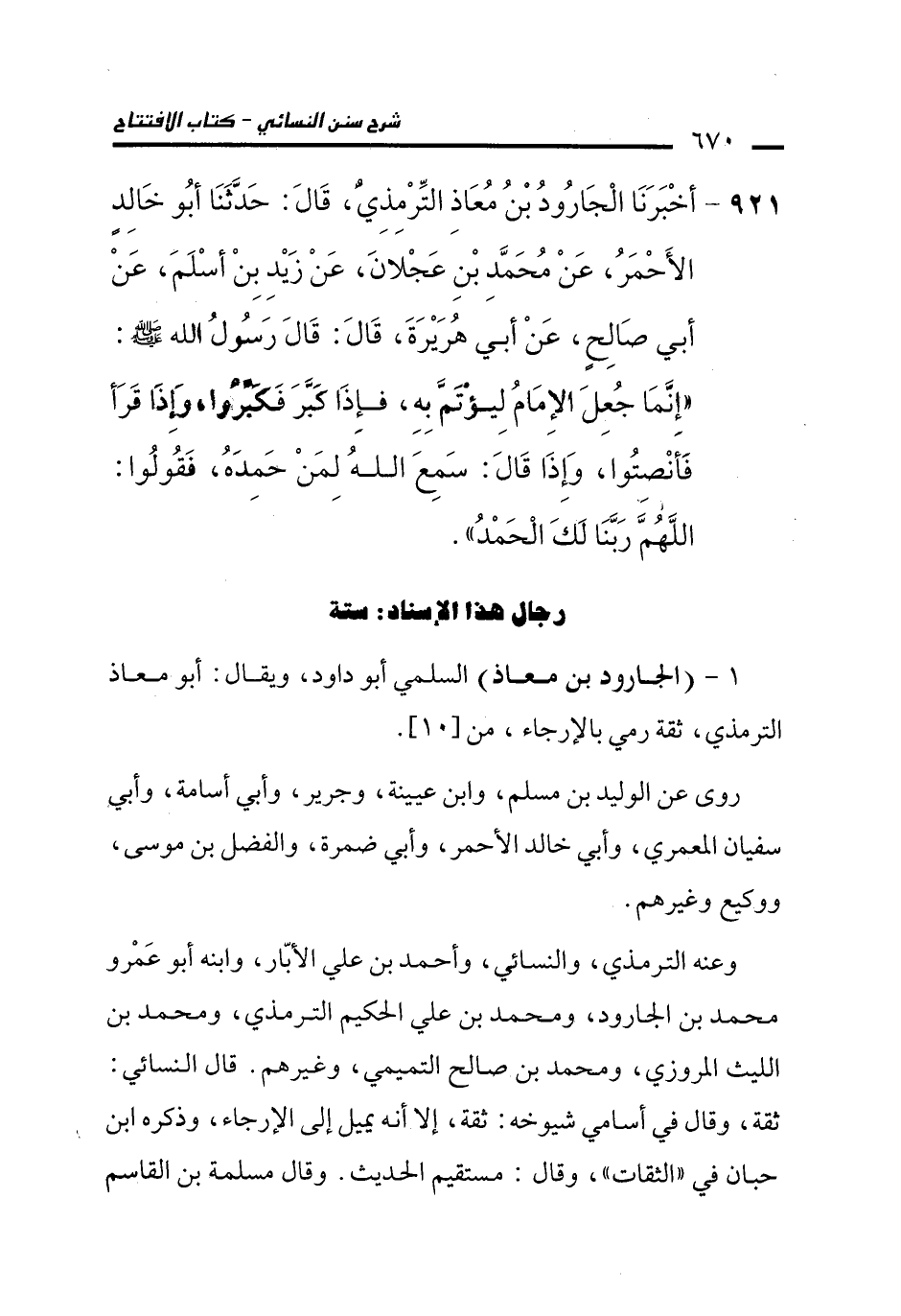 921 - أَخْبَرَنَا الْجَارُودُ بْنُ مُعَاذٍ التِّرْمِذِيُّ، قَالَ: حَدَّثَنَا أَبُو خَالِدٍ الأَحْمَرُ، عَنْ مُحَمَّدِ بْنِ عَجْلاَنَ، عَنْ زَيْدِ بْنِ أَسْلَمَ، عَنْ أَبِي صَالِحٍ، عَنْ أَبِي هُرَيْرَةَ، قَالَ: قَالَ رَسُولُ اللَّهِ - صلى الله عليه وسلم -: "إِنَّمَا جُعِلَ الإِمَامُ لِيُؤْتَمَّ بِهِ، فَإِذَا كَبَّرَ فَكَبِّرُوا، وَإِذَا قَرَأَ فَأَنْصِتُوا، وَإِذَا قَالَ: سَمِعَ اللَّهُ لِمَنْ حَمِدَهُ، فَقُولُوا: اللَّهُمَّ رَبَّنَا لَكَ الْحَمْدُ".