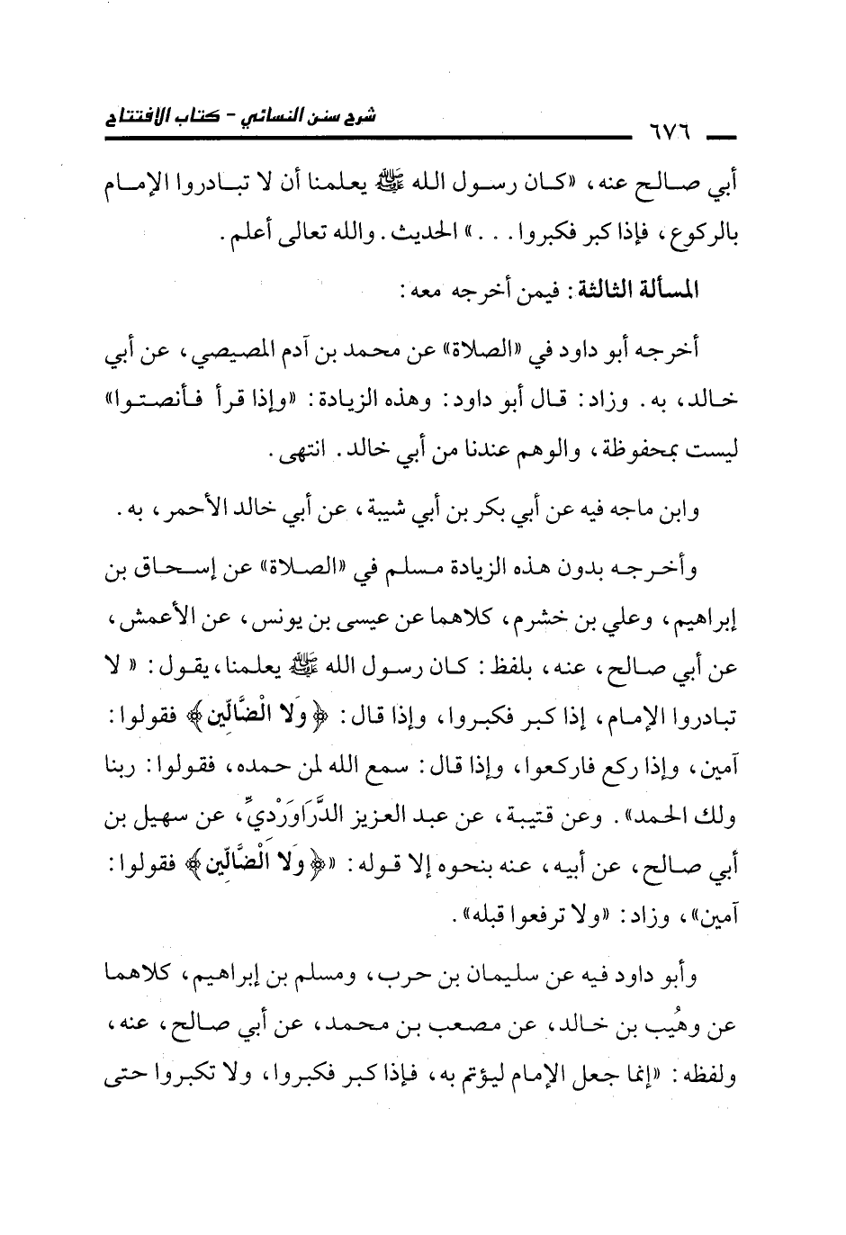 عن أبي صالح، عنه، بلفظ: كان رسول الله - صلى الله عليه وسلم - يعلمنا، يقول: "لا تبادروا الإمام، إذا كبر فكبروا، وإذا قال: {وَلَا الضَّالِّينَ} فقولوا: آمين، وإذا ركع فاركعوا، وإذا قال: سمع الله لمن حمده، فقولوا: ربنا ولك الحمد". وعن قتيبة، عن عبد العزيز الدَّرَاوَرْديِّ، عن سهيل بن أبي صالح، عن أبيه، عنه بنحوه إلا قوله: " {وَلَا الضَّالِّينَ} فقولوا: آمين"، وزاد: "ولا ترفعوا قبله".