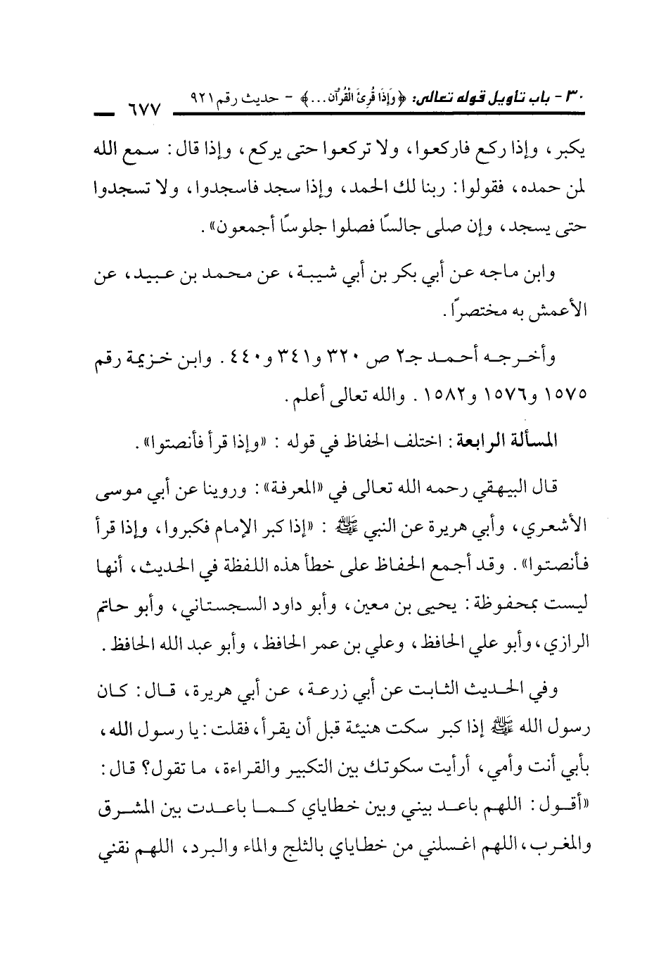 قال البيهقي رحمه الله تعالى في "المعرفة": وروينا عن أبي موسى الأشعري، وأبي هريرة عن النبي - صلى الله عليه وسلم -: "إذا كبر الإمام فكبروا، وإذا قرأ فأنصتوا". وقد أجمع الحفاظ على خطأ هذه اللفظة في الحديث، أنها ليست بمحفوظة: يحيى بن معين، وأبو داود السجستاني، وأبو حاتم الرازي، وأبو علي الحافظ، وعلي بن عمر الحافظ، وأبو عبد الله الحافظ.