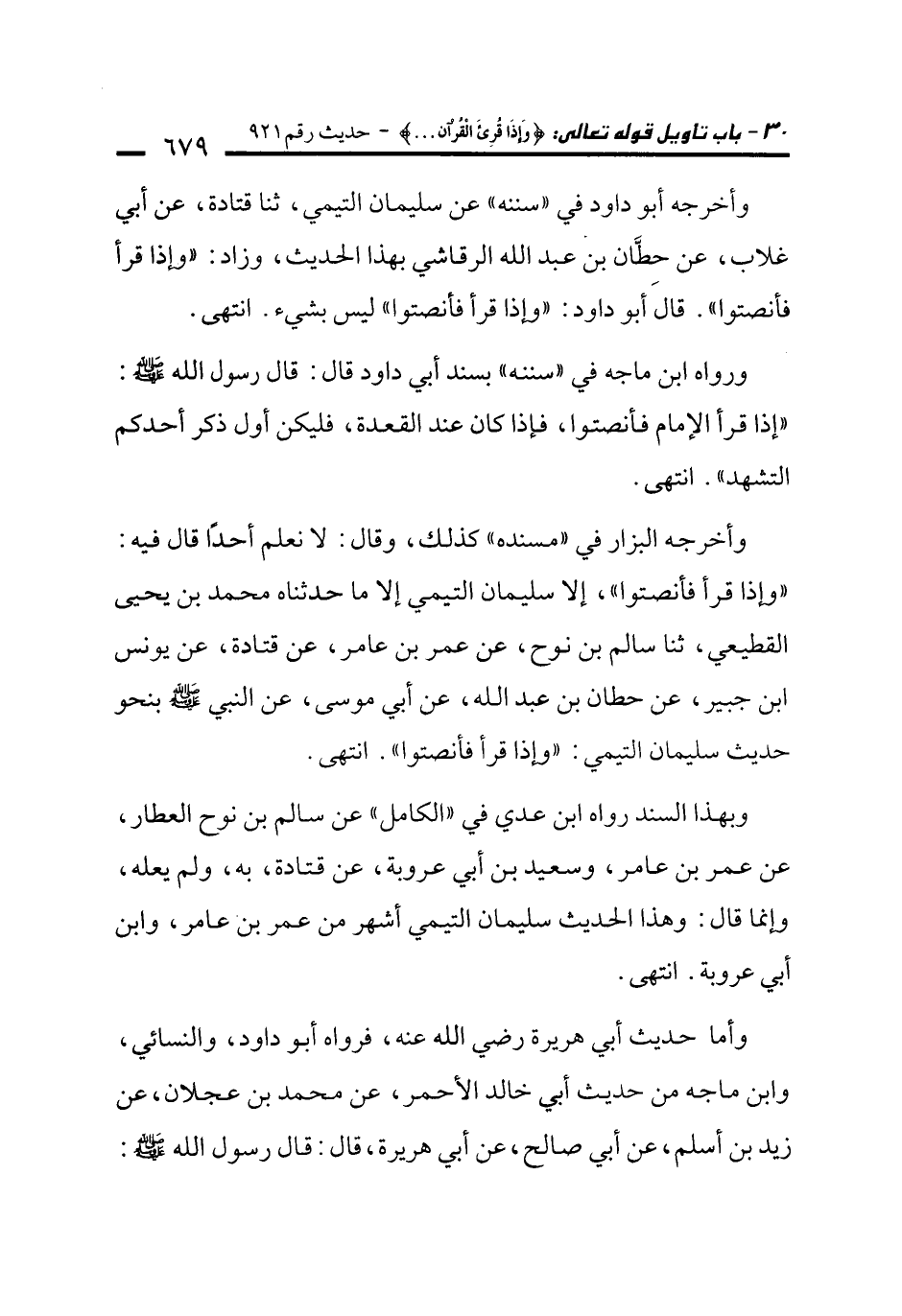 وأخرجه أبو داود في "سننه" عن سليمان التيمي، ثنا قتادة، عن أبي غلاب، عن حطان بن عبد الله الرقاشي بهذا الحديث، وزاد: "وإذا قرأ فأنصتوا". قال أبو داود: "وإذا قرأ فأنصتوا" ليس بشيء. انتهى.