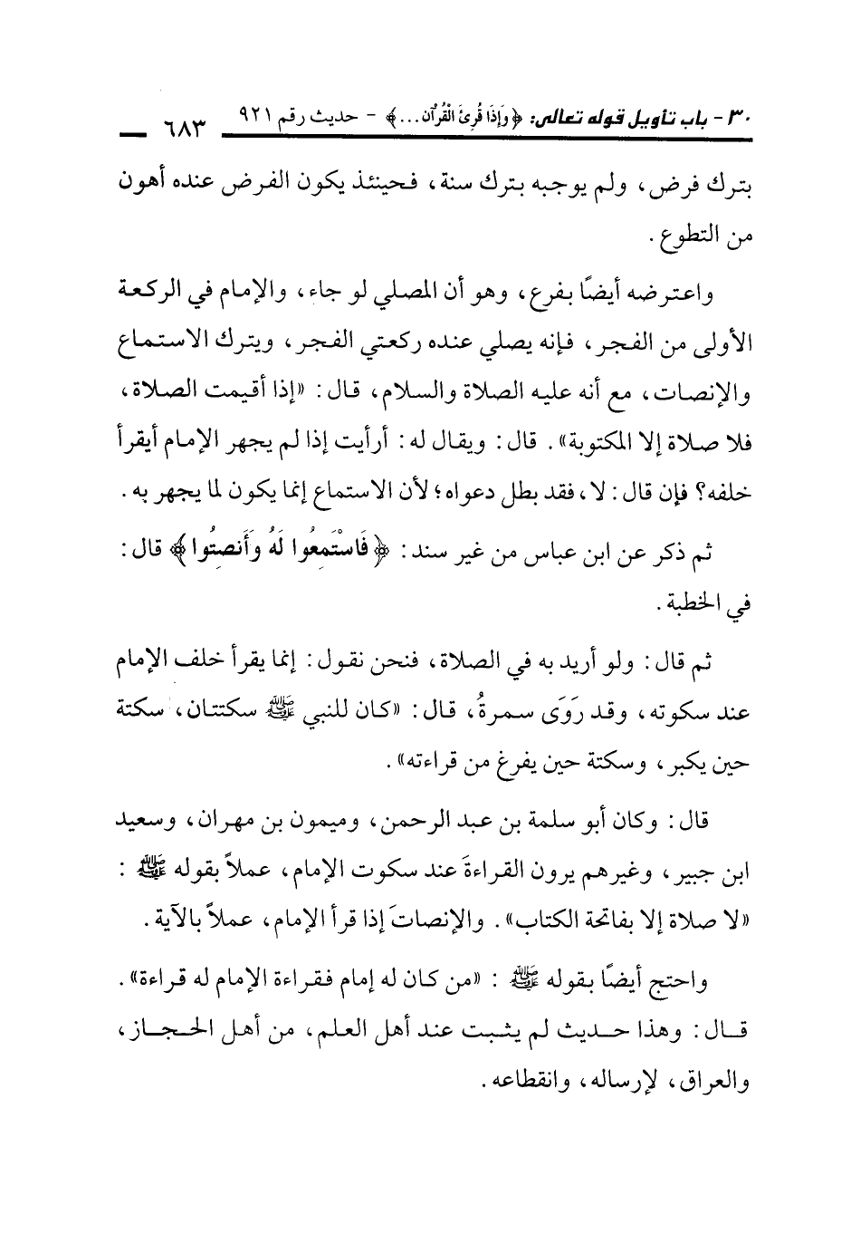 والإنصات، مع أنه عليه الصلاة والسلام، قال: "إذا أقيمت الصلاة، فلا صلاة إلا المكتوبة". قال: ويقال له: أرأيت إذا لم يجهر الإمام أيقرأ خلفه؟ فإن قال: لا، فقد بطل دعواه؛ لأن الاستماع إنما يكون لما يجهر به.