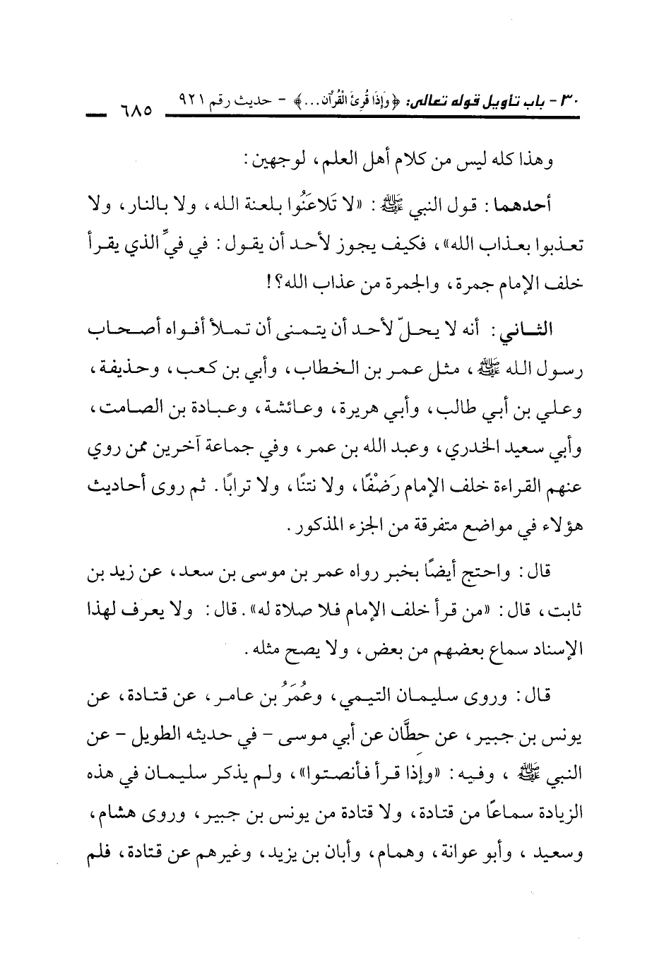 الثاني: أنه لا يحلّ لأحد أن يتمنى أن تملأ أفواه أصحاب رسول الله - صلى الله عليه وسلم -، مثل عمر بن الخطاب، وأبي بن كعب، وحذيفة، وعلي بن أبي طالب، وأبي هريرة، وعائشة، وعبادة بن الصامت، وأبي سعيد الخدري، وعبد الله بن عمر، وفي جماعة آخرين ممن روي عنهم القراءة خلف الإمام رَضْفًا، ولا نتنًا، ولا ترابًا. ثم روى أحاديث هؤلاء في مواضع متفرقة من الجزء المذكور.