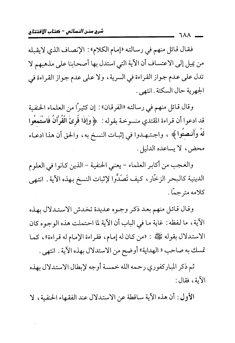 فقال قائل منهم في رسالته "إمام الكلام": الإنصاف الذي لا يقبله من يميل إلى الاعتساف أن الآية التي استدل بها أصحابنا على مذهبهم لا تدل على عدم جواز القراءة في السرية، ولا على عدم جواز القراءة في الجهرية حال السكتة. انتهى.