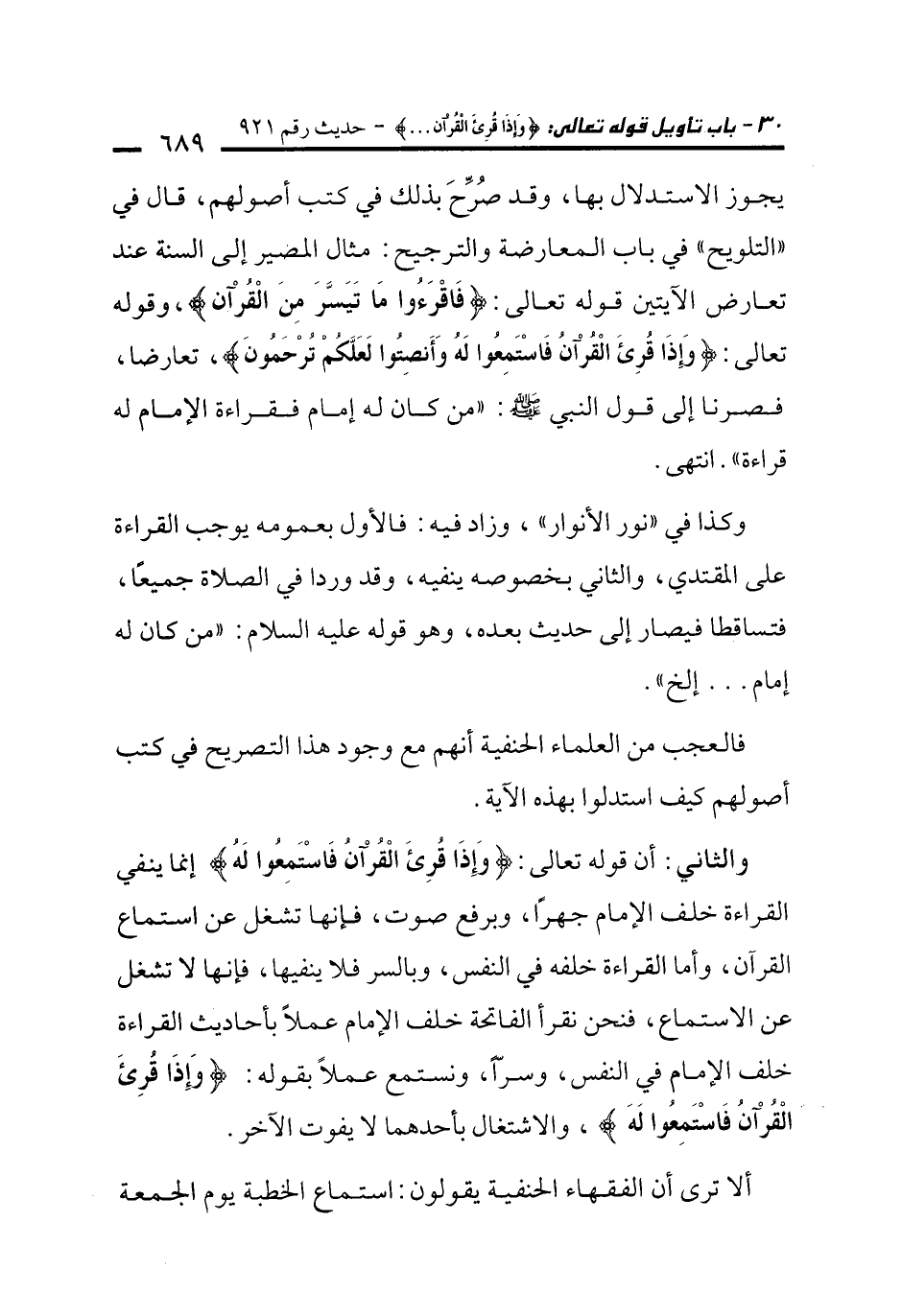 والثاني: أن قوله تعالى: {وَإِذَا قُرِئَ الْقُرْآنُ فَاسْتَمِعُوا لَهُ} إنما ينفي القراءة خلف الإمام جهرًا، وبرفع صوت، فإنها تشغل عن استماع القرآن، وأما القراءة خلفه في النفس، وبالسر فلا ينفيها، فإنها لا تشغل عن الاستماع، فنحن نقرأ الفاتحة خلف الإمام عملًا بأحاديث القراءة خلف الإمام في النفس، وسرًّا، ونستمع عملًا بقوله: {وَإِذَا قُرِئَ الْقُرْآنُ فَاسْتَمِعُوا لَهُ}، والاشتغال بأحدهما لا يفوت الآخر.