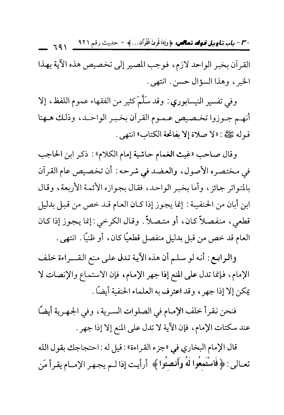 والرابع: أنه لو سلم أن هذه الآية تدل على منع القراءة خلف الإمام، فإنما تدل على المنع إذا جهر الإمام، فإن الاستماع والإنصات لا يمكن إلا إذا جهر، وقد اعترف به العلماء الحنفية أيضًا.