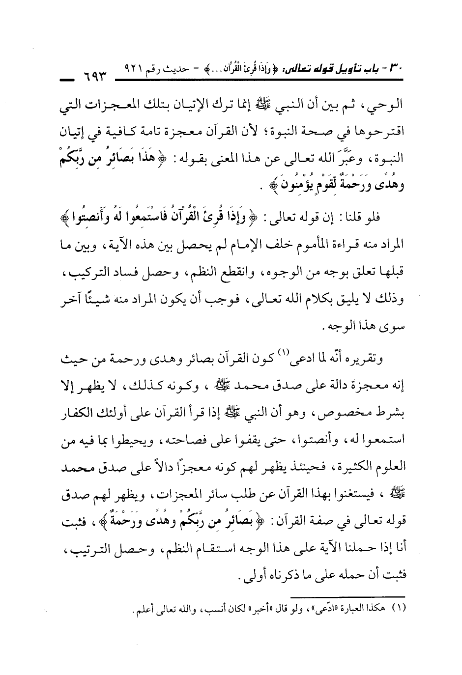 وتقريره أنّه لما ادعى (¬1) كون القرآن بصائر وهدى ورحمة من حيث إنه معجزة دالة على صدق محمد - صلى الله عليه وسلم -، وكونه كذلك , لا يظهر إلا بشرط خصوص، وهو أن النبي - صلى الله عليه وسلم - إذا قرأ القرآن على أولئك الكفار استمعوا له، وأنصتوا، حتى يقفوا على فصاحته، ويحيطوا بما فيه من العلوم الكثيرة، فحينئذ يظهر لهم كونه معجزًا دالًا على صدق محمد - صلى الله عليه وسلم -، فيستغنوا بهذا القرآن عن طلب سائر المعجزات، ويظهر لهم صدق قوله تعالى في صفة القرآن: {بَصَائِرُ مِنْ رَبِّكُمْ وَهُدًى وَرَحْمَةٌ}، فثبت أنا إذا حملنا الآية على هذا الوجه استقام النظم، وحصل الترتيب، فثبت أن حمله على ما ذكرناه أولى.