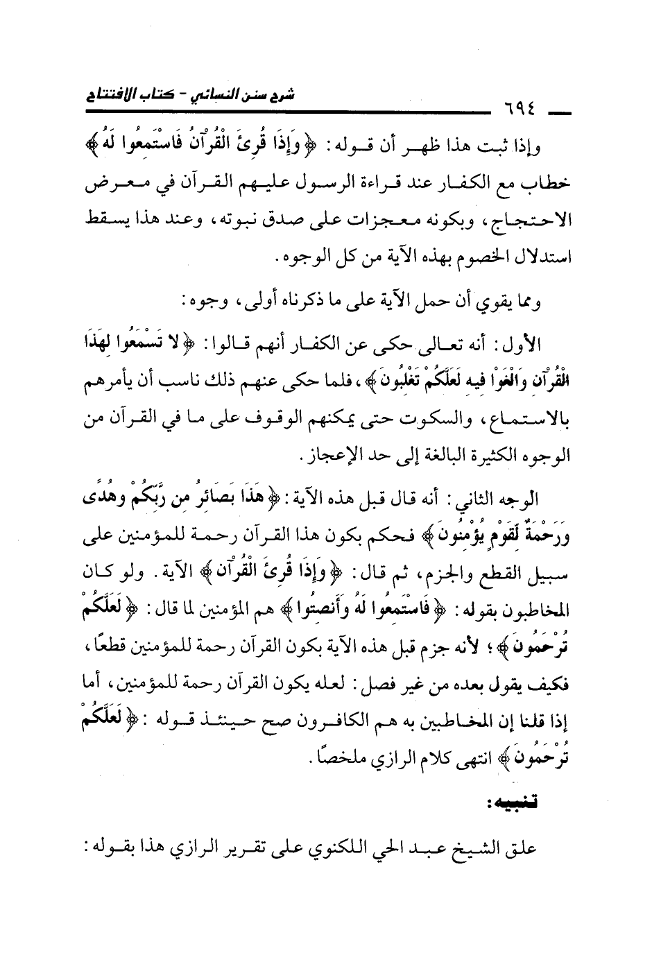 الوجه الثاني: أنه قال قبل هذه الآية: {هَذَا بَصَائِرُ مِنْ رَبِّكُمْ وَهُدًى وَرَحْمَةٌ لِقَوْمٍ يُؤْمِنُونَ} فحكم بكون هذا القرآن رحمة للمؤمنين على سبيل القطع والجزم، ثم قال: {وَإِذَا قُرِئَ الْقُرْآنُ} الآية. ولو كان المخاطبون بقوله: {فَاسْتَمِعُوا لَهُ وَأَنْصِتُوا} هم المؤمنين لما قال: {لَعَلَّكُمْ تُرْحَمُونَ}؛ لأنه جزم قبل هذه الآية بكون القرآن رحمة للمؤمنين قطعًا، فكيف يقول بعده من غير فصل: لعله يكون القرآن رحمة للمؤمنين، أما إذا قلنا إن المخاطبين به هم الكافرون صح حينئذ قوله: {لَعَلَّكُمْ تُرْحَمُونَ} انتهى كلام الرازي ملخصًا.