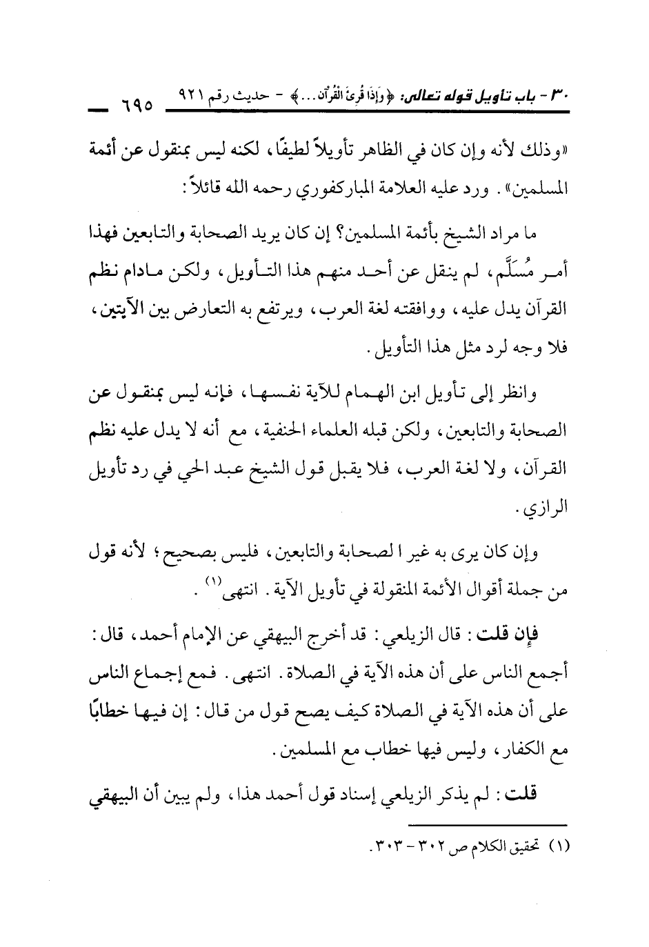 "وذلك لأنه وإن كان في الظاهر تأويلًا لطيفًا، لكنه ليس بمنقول عن أئمة المسلمين". ورد عليه العلامة المباركفوري رحمه الله قائلًا:
