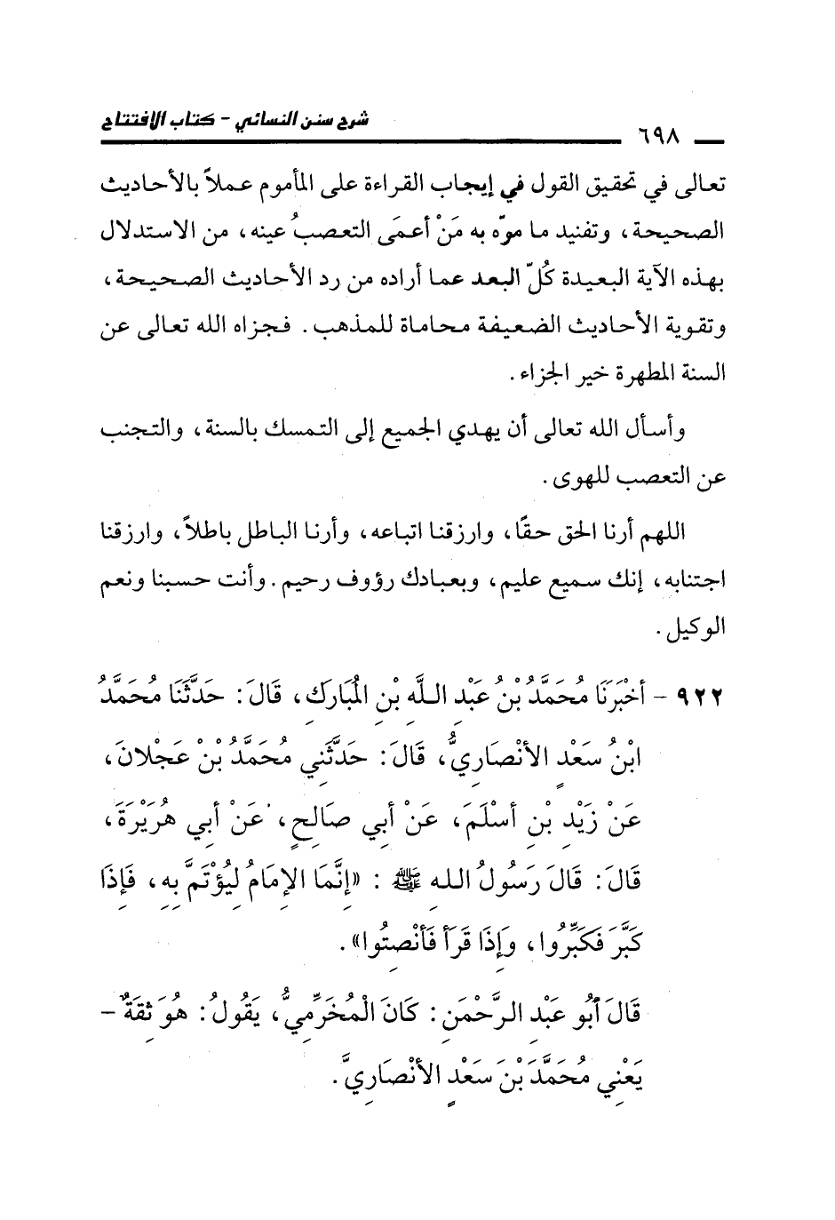 922 - أَخْبَرَنَا مُحَمَّدُ بْنُ عَبْدِ اللَّهِ بْنِ الْمُبَارَكِ، قَالَ: حَدَّثَنَا مُحَمَّدُ بْنُ سَعْدٍ الأَنْصَارِيُّ، قَالَ: حَدَّثَنِي مُحَمَّدُ بْنُ عَجْلاَنَ، عَنْ زَيْدِ بْنِ أَسْلَمَ، عَنْ أَبِي صَالِحٍ، عَنْ أَبِي هُرَيْرَةَ، قَالَ: قَالَ رَسُولُ اللَّهِ - صلى الله عليه وسلم -: "إِنَّمَا الإِمَامُ لِيُؤْتَمَّ بِهِ فَإِذَا كَبَّرَ فَكَبِّرُوا وَإِذَا قَرَأَ فَأَنْصِتُوا".
