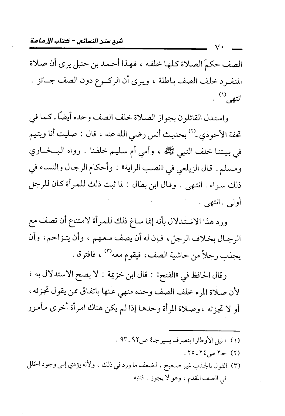 وقال الحافظ في "الفتح": قال ابن خزيمة. لا يصح الاستدلال به؛ لأن صلاة المرء خلف الصف وحده منهي عنها باتفاق ممن يقول تجزئه، أو لا تجزئه، وصلاة المرأة وحدها إذا لم يكن هناك امرأة أخرى مأمور