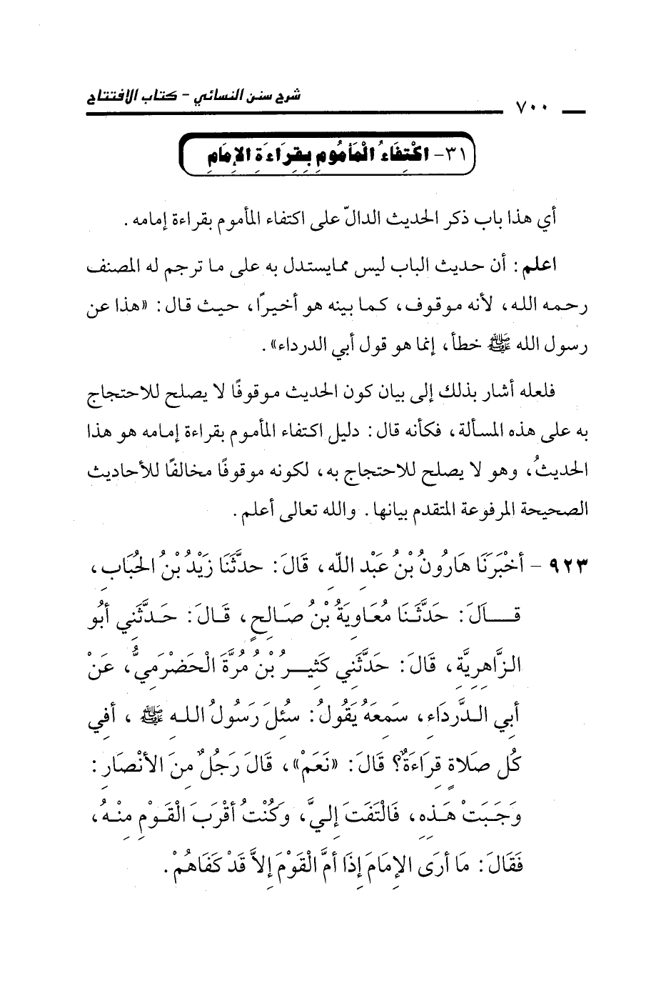 923 - أَخْبَرَنِي هَارُونُ بْنُ عَبْدِ اللَّهِ، قَالَ: حَدَّثَنَا زَيْدُ بْنُ الْحُبَابِ، قَالَ: حَدَّثَنَا مُعَاوِيَةُ بْنُ صَالِحٍ، قَالَ: حَدَّثَنِي أَبُو الزَّاهِرِيَّةِ، قَالَ: حَدَّثَنِي كَثِيرُ بْنُ مُرَّةَ الْحَضْرَمِيُّ، عَنْ أَبِي الدَّرْدَاءِ، سَمِعَهُ يَقُولُ: سُئِلَ رَسُولُ اللَّهِ - صلى الله عليه وسلم -، أَفِي كُلِّ صَلاَةٍ قِرَاءَةٌ؟ قَالَ: "نَعَمْ". قَالَ رَجُلٌ مِنَ الأَنْصَارِ: وَجَبَتْ هَذِهِ، فَالْتَفَتَ إِلَيَّ، وَكُنْتُ أَقْرَبَ الْقَوْمِ مِنْهُ، فَقَالَ: مَا أَرَى الإِمَامَ إِذَا أَمَّ الْقَوْمَ إِلاَّ قَدْ كَفَاهُمْ.