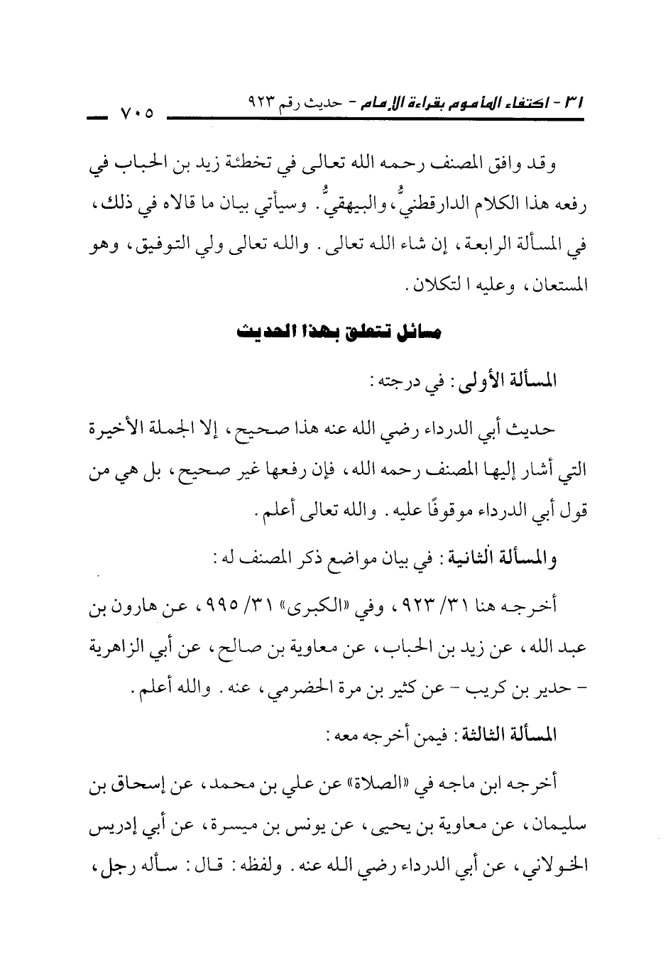وقد وافق المصنف رحمه الله تعالى في تخطئة زيد بن الحباب في رفعه هذا الكلام الدارقطنيُّ، والبيهقيُّ. وسيأتي بيان ما قالاه في ذلك، في المسألة الرابعة، إن شاء الله تعالى. والله تعالى ولي التوفيق، وهو المستعان، وعليه التكلان.