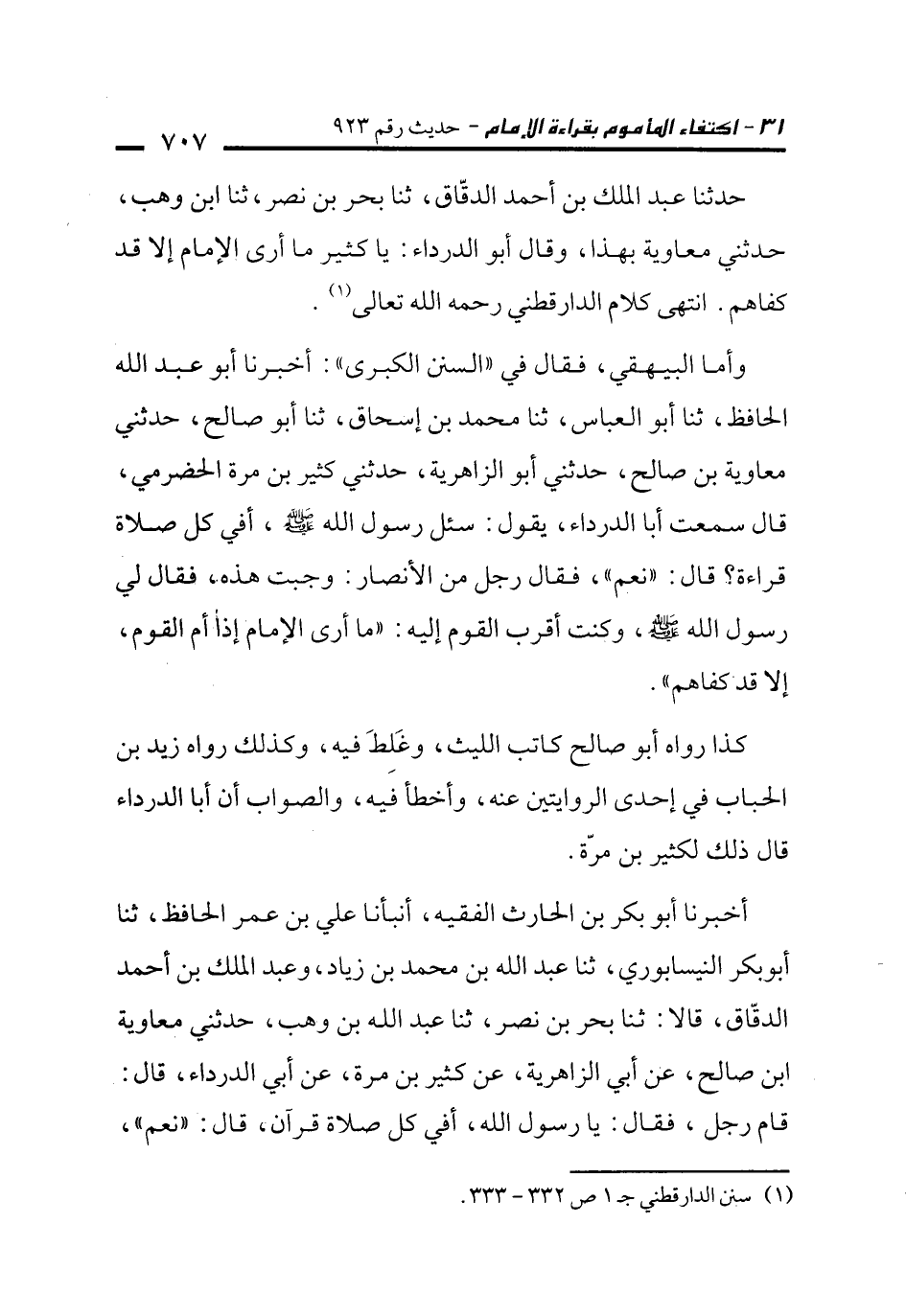 حدثنا عبد الملك بن أحمد الدقّاق، ثنا بحر بن نصر، ثنا ابن وهب، حدثني معاوية بهذا، وقال أبو الدرداء: يا كثير ما أرى الإمام إلا قد كفاهم. انتهى كلام الدارقطني رحمه الله تعالى (¬1).
