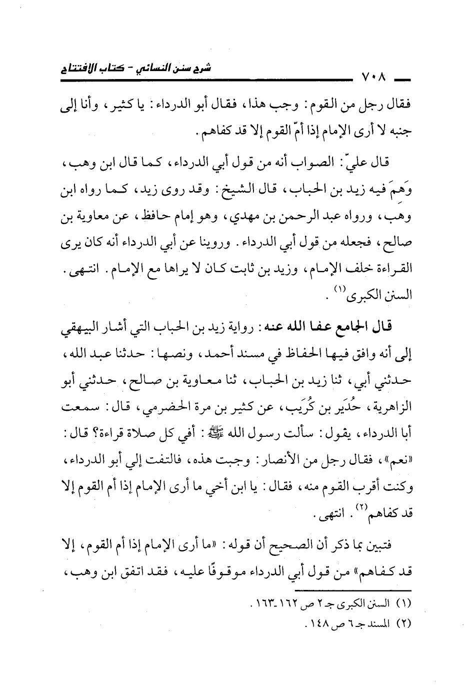 قال الجامع عفا الله عنه: رواية زيد بن الحباب التي أشار البيهقي إلى أنه وافق فيها الحفاظ في مسند أحمد، ونصها: حدثنا عبد الله، حدثني أبي، ثنا زيد بن الحباب، ثنا معاوية بن صالح، حدثني أبو الزاهرية، حُدَير بن كُرَيب، عن كثير بن مرة الحضرمي، قال: سمعت أبا الدرداء، يقول: سألت رسول الله - صلى الله عليه وسلم -: أفي كل صلاة قراءة؟ قال: "نعم"، فقال رجل من الأنصار: وجبت هذه، فالتفت إلي أبو الدرداء، وكنت أقرب القوم منه، فقال: يا ابن أخي ما أرى الإمام إذا أم القوم إلا قد كفاهم (¬2). انتهى.