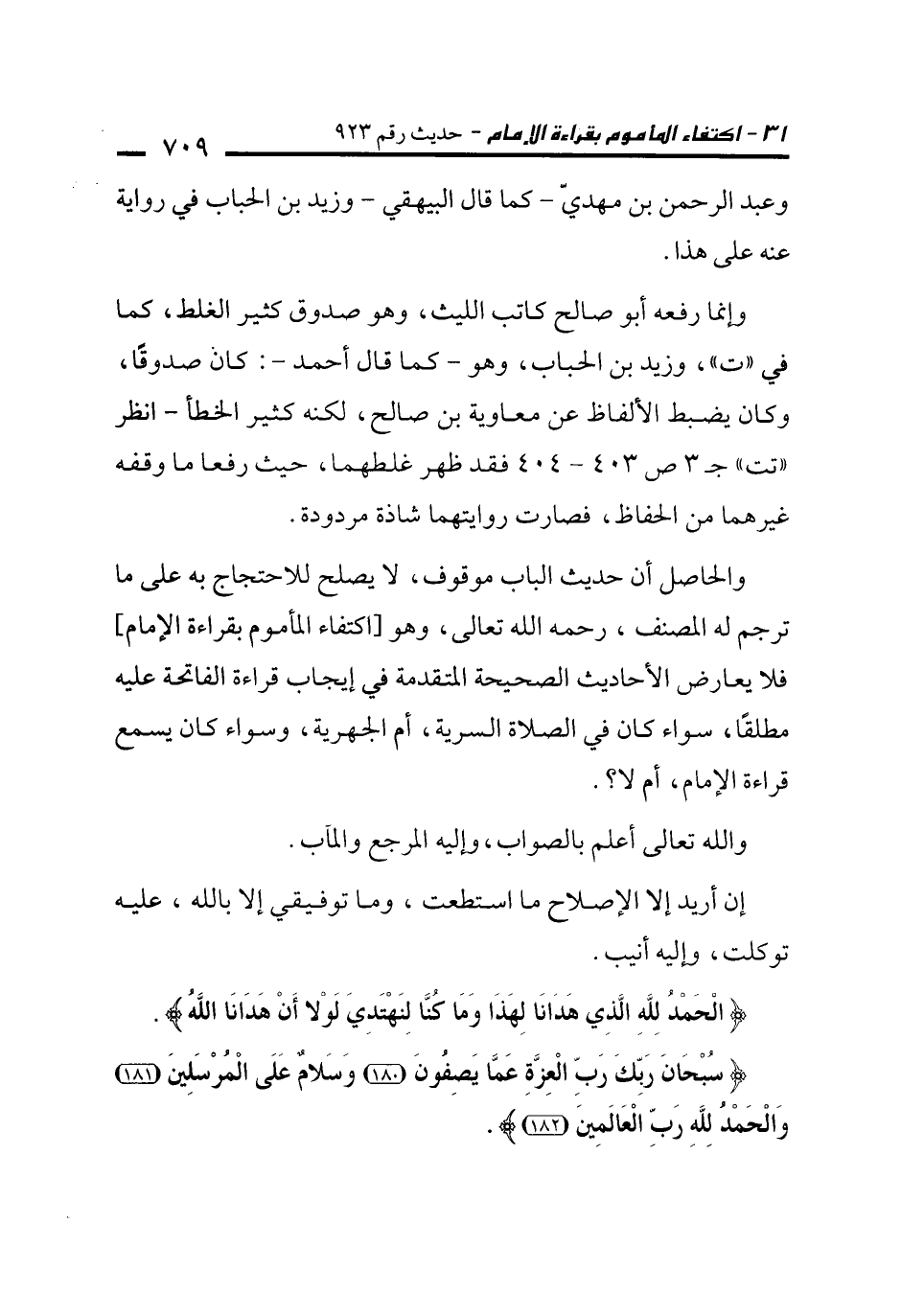 والحاصل أن حديث الباب موقوف، لا يصلح للاحتجاج به على ما ترجم له المصنف، رحمه الله تعالى، وهو [اكتفاء المأموم بقراءة الإمام] فلا يعارض الأحاديث الصحيحة المتقدمة في إيجاب قراءة الفاتحة عليه مطلقًا، سواء كان في الصلاة السرية، أم الجهرية، وسواء كان يسمع قراءة الإمام، أم لا؟.