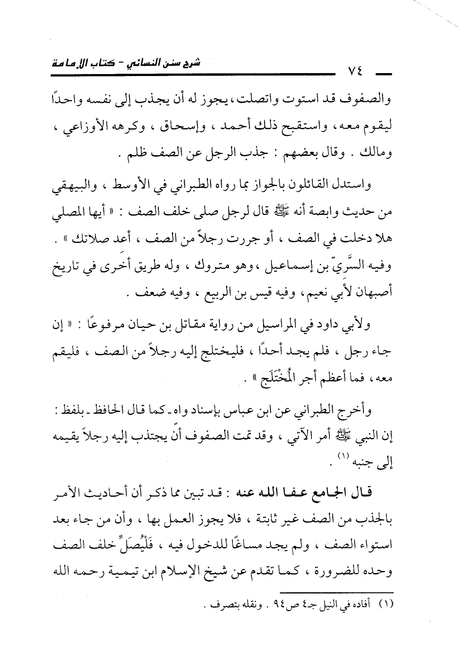 قال الجامع عفا الله عنه: قد تبين مما ذكر أن أحاديث الأمر بالجذب من الصف غير ثابتة، فلا يجوز العمل بها، وأن من جاء بعد استواء الصف، ولم يجد مساغًا للدخول فيه، فَلْيُصَلِّ خلف الصف وحده للضرورة، كما تقدم عن شيخ الإِسلام ابن تيمية رحمه الله