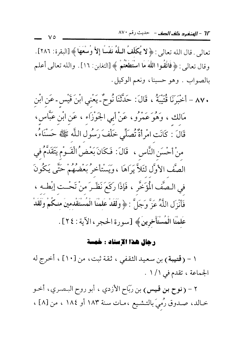 870 - أَخْبَرَنَا قُتَيْبَةُ، قَالَ: حَدَّثَنَا نُوحٌ -يَعْنِي ابْنَ قَيْسٍ- عَنِ ابْنِ مَالِكٍ، وَهُوَ عَمْرٌو، عَنْ أَبِي الْجَوْزَاءِ، عَنِ ابْنِ عَبَّاسٍ، قَالَ: كَانَتِ امْرَأَةٌ تُصَلِّي خَلْفَ رَسُولِ اللَّهِ -صلى الله عليه وسلم- حَسْنَاءُ، مِنْ أَحْسَنِ النَّاسِ، قَالَ: فَكَانَ بَعْضُ الْقَوْمِ يَتَقَدَّمُ فِي الصَّفِّ الأَوَّلِ لِئَلاَّ يَرَاهَا، وَيَسْتَأْخِرُ بَعْضُهُمْ حَتَّى يَكُونَ فِي الصَّفِّ الْمُؤَخَّرِ، فَإِذَا رَكَعَ نَظَرَ مِنْ تَحْتِ إِبْطِهِ، فَأَنْزَلَ اللَّهُ عَزَّ وَجَلَّ: {وَلَقَدْ عَلِمْنَا الْمُسْتَقْدِمِينَ مِنْكُمْ وَلَقَدْ عَلِمْنَا الْمُسْتَأْخِرِينَ} [سورة الحجر، الآية: 24].