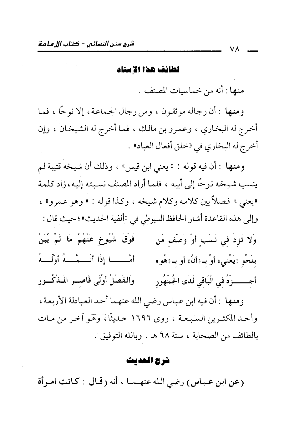 ومنها: أن فيه قوله: "يعني ابن قيس"، وذلك أن شيخه قتيبة لم ينسب شيخه نوحًا إلى أبيه، فلما أراد المصنف نسبته إليه، زاد كلمة "يعني" فصلاً بين كلامه وكلام شيخه، وكذا قوله: "وهو عمرو"، وإلى هذه القاعدة أشار الحافظ السيوطي في "ألفية الحديث"؛ حيث قال: