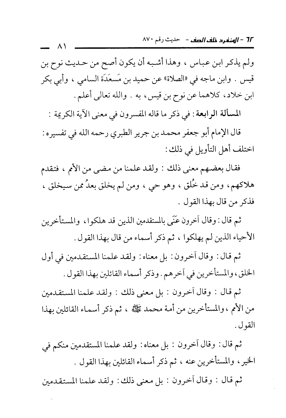 ثم قال: وقال آخرون: بل معنى ذلك: ولقد علمنا المستقدمين من الأمم، والمستأخرين من أمة محمد -صلى الله عليه وسلم-، ثم ذكر أسماء القائلين بهذا القول.