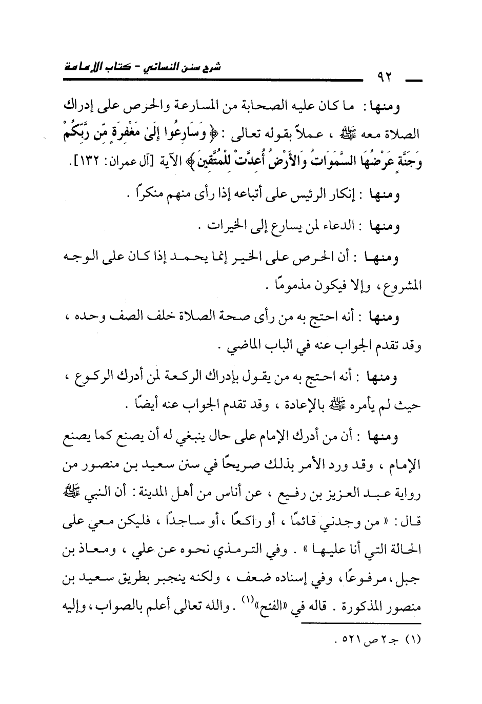 ومنها: أن من أدرك الإِمام على حال ينبغي له أن يصنع كما يصنع الإِمام، وقد ورد الأمر بذلك صريحًا في سنن سعيد بن منصور من رواية عبد العزيز بن رفيع، عن أناس من أهل المدينة: أن النبي -صلى الله عليه وسلم- قال: "من وجدني قائمًا، أو راكعًا، أو ساجدًا، فليكن معي على الحالة التي أنا عليها". وفي الترمذي نحوه عن علي، ومعاذ بن جبل، مرفوعًا، وفي إسناده ضعف، ولكنه ينجبر بطريق سعيد بن منصور المذكورة. قاله في "الفتح" (¬1). والله تعالى أعلم بالصواب، وإليه