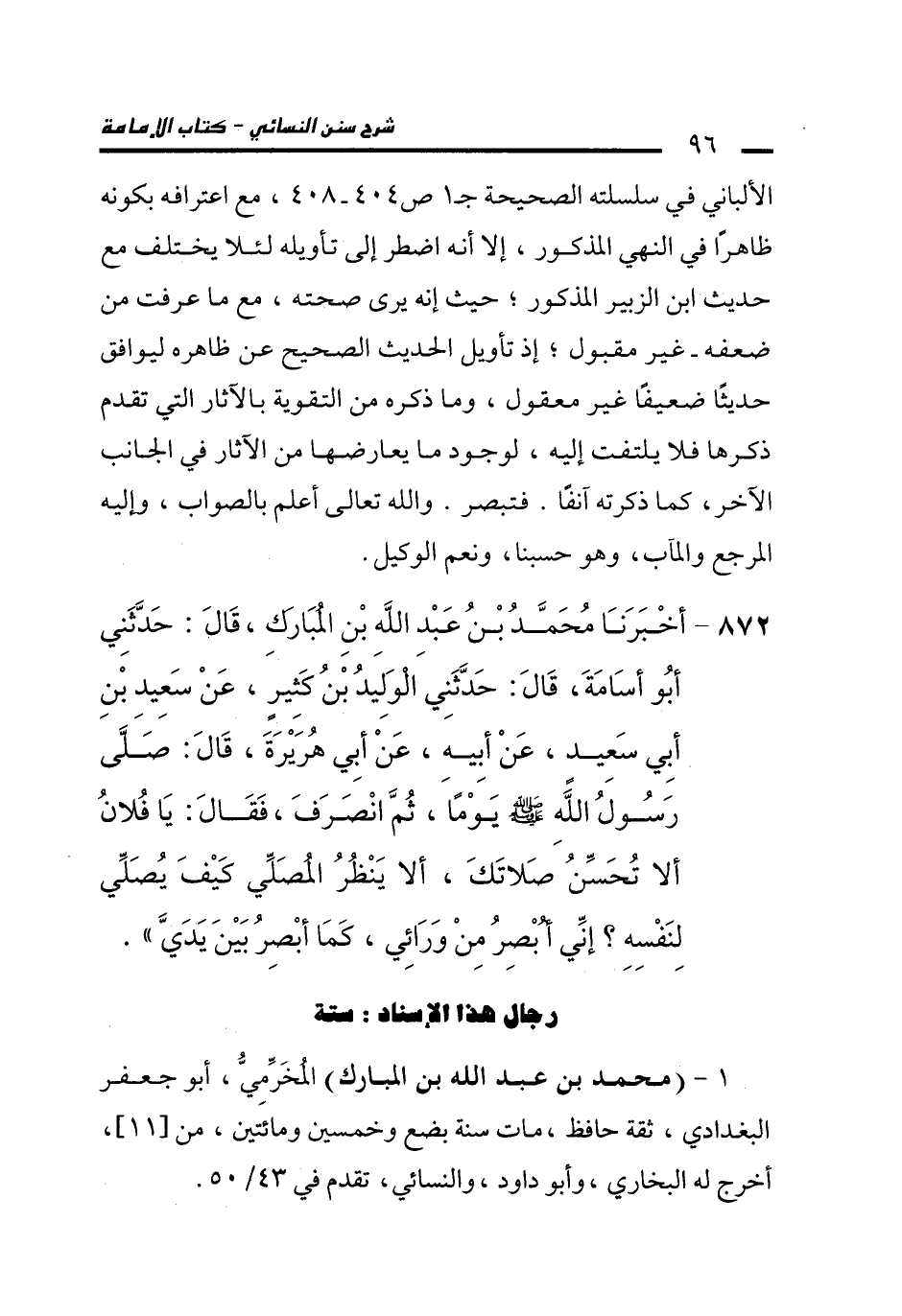 872 - أَخْبَرَنَا مُحَمَّدُ بْنُ عَبْدِ اللَّهِ بْنِ الْمُبَارَكِ، قَالَ: حَدَّثَنِي أَبُو أُسَامَةَ، قَالَ: حَدَّثَنِي الْوَلِيدُ بْنُ كَثِيرٍ، عَنْ سَعِيدِ بْنِ أَبِي سَعِيدٍ، عَنْ أَبِيهِ، عَنْ أَبِي هُرَيْرَةَ، قَالَ: صَلَّى رَسُولُ اللَّهِ -صلى الله عليه وسلم- يَوْمًا، ثُمَّ انْصَرَفَ، فَقَالَ: يَا فُلاَنُ أَلاَ تُحَسِّنُ صَلاَتَكَ، أَلاَ يَنْظُرُ الْمُصَلِّي كَيْفَ يُصَلِّي لِنَفْسِهِ؟ إِنِّي أُبْصِرُ مِنْ وَرَائِي، كَمَا أُبْصِرُ بَيْنَ يَدَيَّ.
