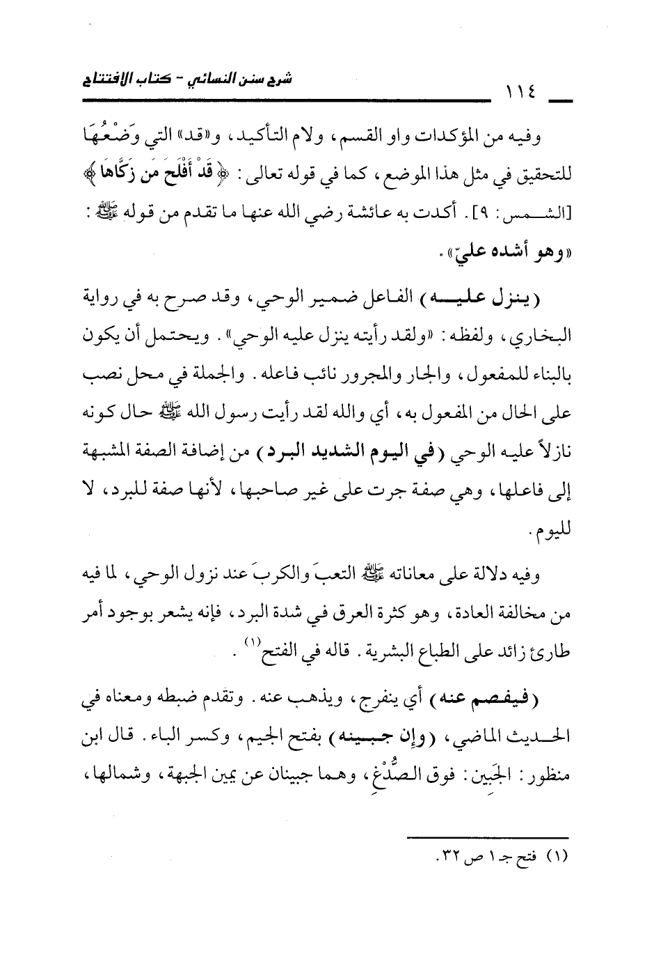 (فيفصم عنه) أي ينفرج، ويذهب عنه. وتقدم ضبطه ومعناه في الحديث الماضي، (وإِن جبينه) بفتح الجيم، وكسر الباء. قال ابن منظور: الجَبِين: فوق الصُّدْغ، وهما جبينان عن: يمين الجبهة، وشمالها،