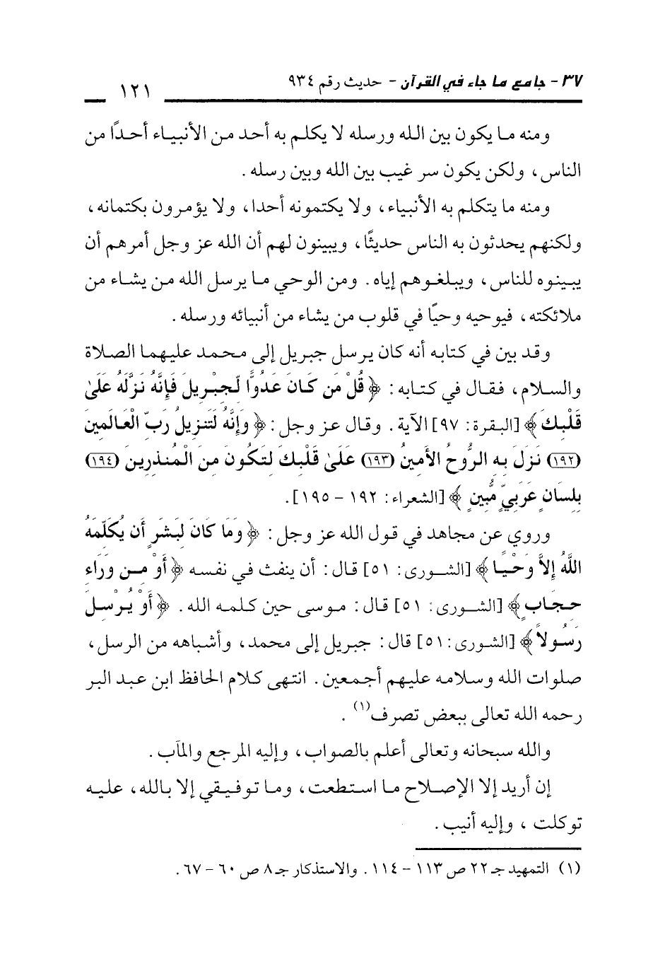وروي عن مجاهد في قول الله عز وجل: {وَمَا كَانَ لِبَشَرٍ أَنْ يُكَلِّمَهُ اللَّهُ إِلَّا وَحْيًا} [الشورى: 51] قال: أن ينفث في نفسه {أَوْ مِنْ وَرَاءِ حِجَابٍ} [الشورى: 51] قال: موسى حين كلمه الله. {أَوْ يُرْسِلَ رَسُولًا} [الشورى: 51] قال: جبريل إلى محمد، وأشباهه من الرسل، صلوات الله وسلامه عليهم أجمعين. انتهى كلام الحافظ ابن عبد البر رحمه الله تعالى ببعض تصرف (¬1).