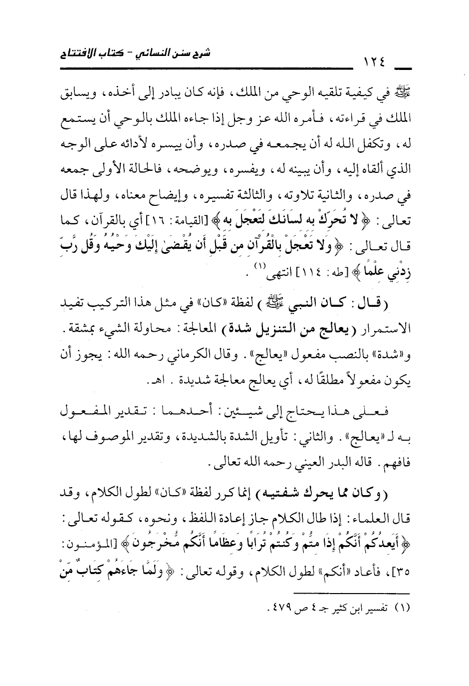 - صلى الله عليه وسلم - في كيفية تلقيه الوحي من الملك، فإنه كان يبادر إلى أخذه، ويسابق الملك في قراءته، فأمره الله عز وجل إذا جاءه الملك بالوحي أن يستمع له، وتكفل الله له أن يجمعه في صدره، وأن ييسره لأدائه على الوجه الذي ألقاه إليه، وأن يبينه له، ويفسره، ويوضحه، فالحالة الأولى جمعه في صدره، والثانية تلاوته، والثالثة تفسيره، وإيضاح معناه، ولهذا قال تعالى: {لَا تُحَرِّكْ بِهِ لِسَانَكَ لِتَعْجَلَ بِهِ} [القيامة: 16] أي بالقرآن، كما قال تعالى. {وَلَا تَعْجَلْ بِالْقُرْآنِ مِنْ قَبْلِ أَنْ يُقْضَى إِلَيْكَ وَحْيُهُ وَقُلْ رَبِّ زِدْنِي عِلْمًا} [طه: 114] انتهى (¬1).