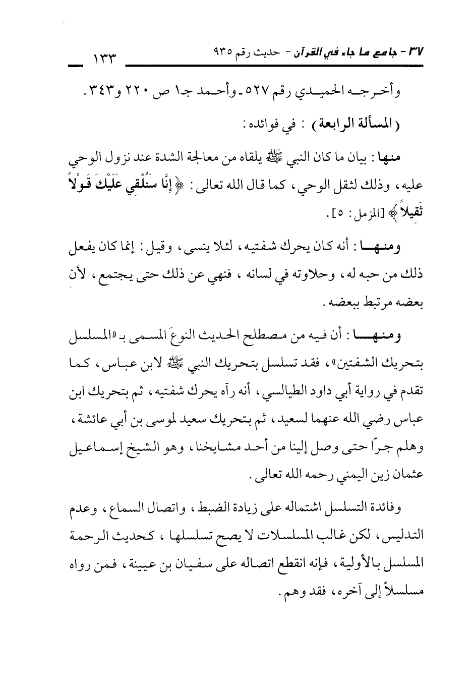ومنها: أن فيه من مصطلح الحديث النوعَ المسمى بـ "المسلسل بتحريك الشفتين"، فقد تسلسل بتحريك النبي - صلى الله عليه وسلم - لابن عباس، كما تقدم في رواية أبي داود الطيالسي، أنه رآه يحرك شفتيه، ثم بتحريك ابن عباس رضي الله عنهما لسعيد، ثم بتحريك سعيد لموسى بن أبي عائشة، وهلم جرّا حتى وصل إلينا من أحد مشايخنا، وهو الشيخ إسماعيل عثمان زين اليمني رحمه الله تعالى.