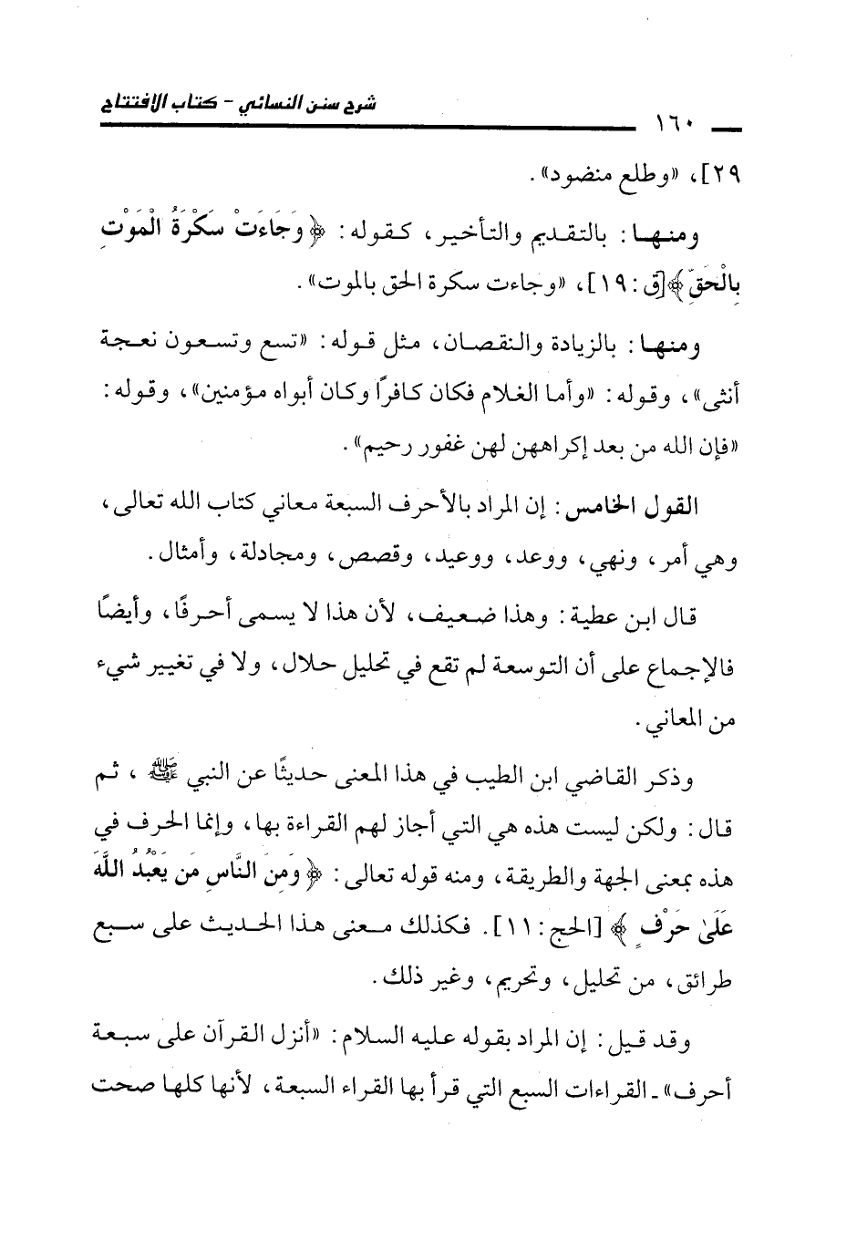 وذكر القاضى ابن الطيب في هذا المعنى حديثًا عن النبي - صلى الله عليه وسلم -، ثم قال: ولكن ليست هذه هي التي أجاز لهم القراءة بها، وإنما الحرف في هذه بمعنى الجهة والطريقة، ومنه قوله تعالى: {وَمِنَ النَّاسِ مَنْ يَعْبُدُ اللَّهَ عَلَى حَرْفٍ} [الحج: 11]، فكدْلك معنى هذا الحديث على سبع طرائق، من تحليل، وتحريم، وغير ذلك.