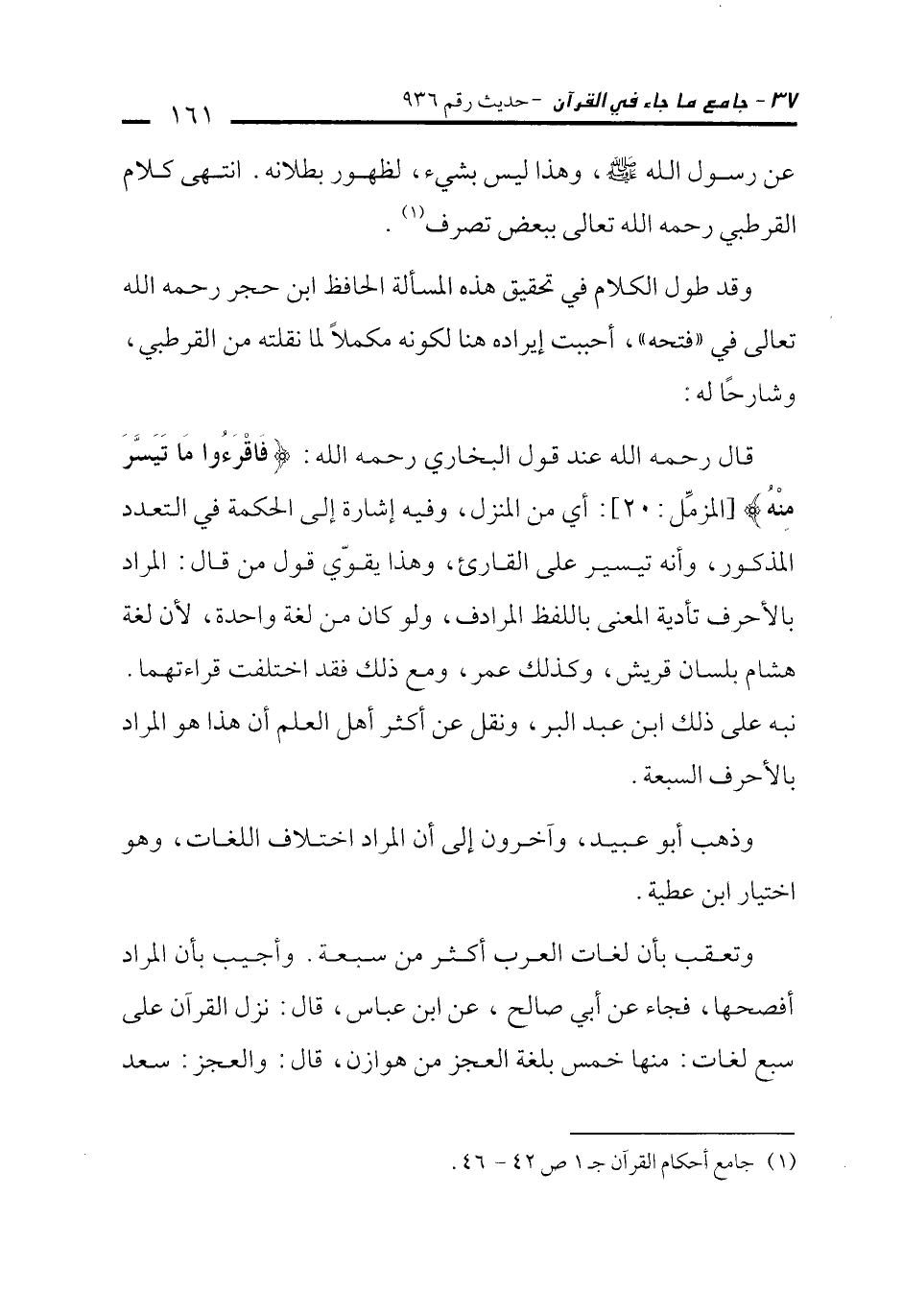 قال رحمه الله عند قول البخاري رحمه الله: {فَاقْرَءُوا مَا تَيَسَّرَ مِنَهُ} [المزمِّل: 25]: أي من المنزل، وفيه إشارة إلى الحكمة في التعدد المذكور، وأنه تيسير على القارئ، وهذا يقوّي قول من قال: المراد بالأحرف تأدية المعنى باللفظ المرادف، ولو كان من لغة واحدة، لأن لغة هشام بلسان قريش، وكذلك عمر، ومع ذلك فقد اختلفت قراءتهما. نبه على ذلك ابن عبد البر، ونقل عن أكثر أهل العلم أن هذا هو المراد بالأحرف السبعة.