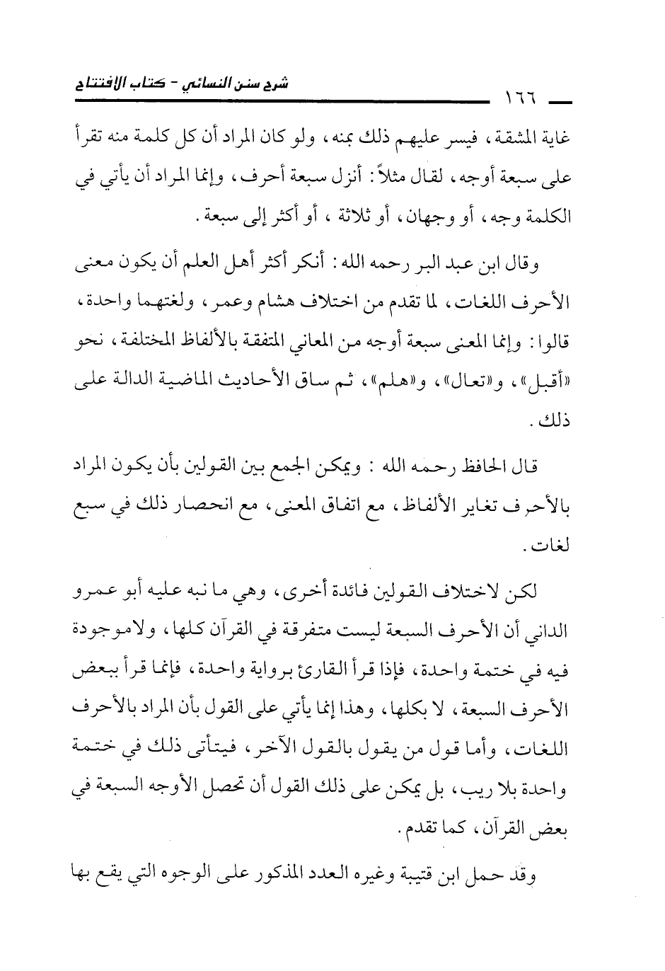 وقال ابن عبد البر رحمه الله: أنكو أكثر أهل العلم أن يكون معنى الأحرف اللغات، لا تقدم من اختلاف هشام وعمر، ولغتهما واحدة، قالوا: وإنما المعنى سبعة أوجه من المعاني المتفقة بالألفاظ المختلفة، نحو "أقبل"، و"تعال"، و"هلم"، ثم ساق الأحاديث الماضية الدالة على ذلك.
